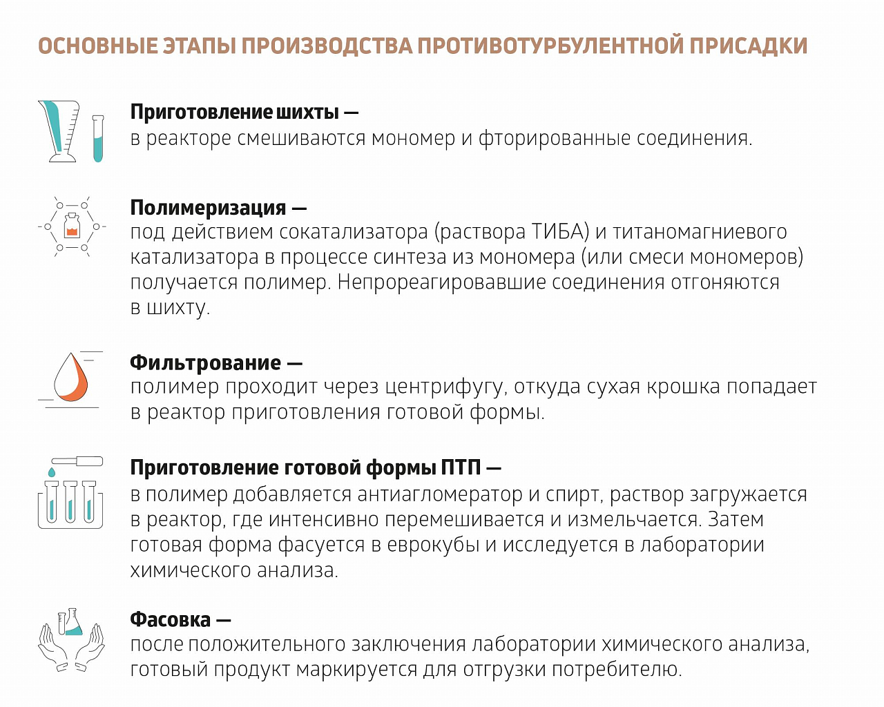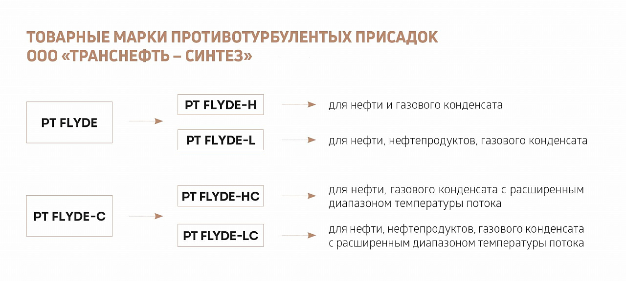 Сейчас завод выпускает две товарные линейки противотурбулентной присадки — универсальную и специализированную, которая применяется при низких температурах транспортировки. Появление технологии последней было инициировано АО «Транснефть — Север», к ее разработке привлекались ведущие российские вузы. В 2021 году был получен патент на выпуск ПТП с улучшенными показателями эффективности в условиях низких температур.