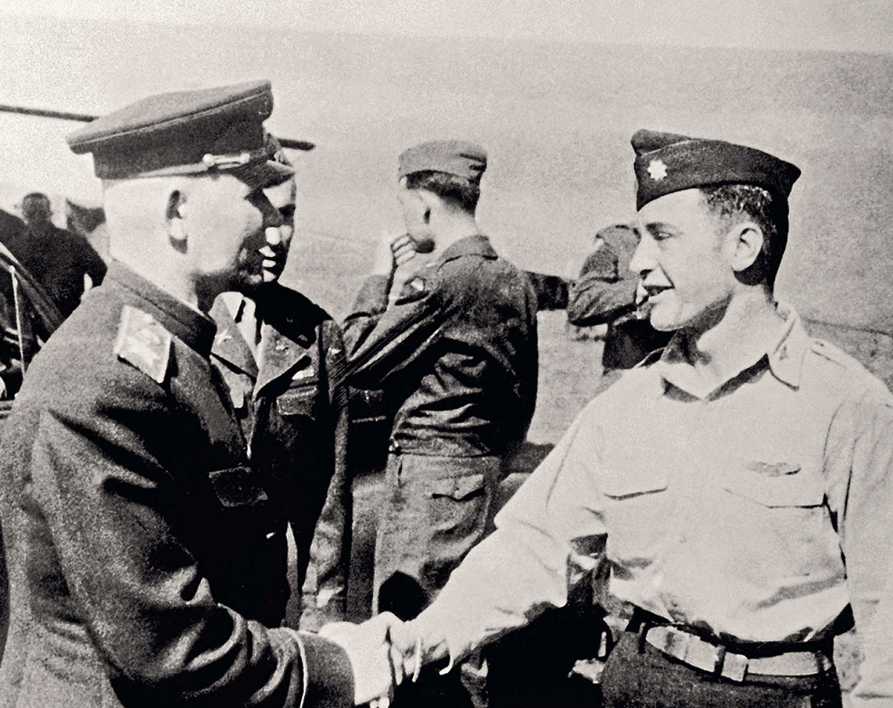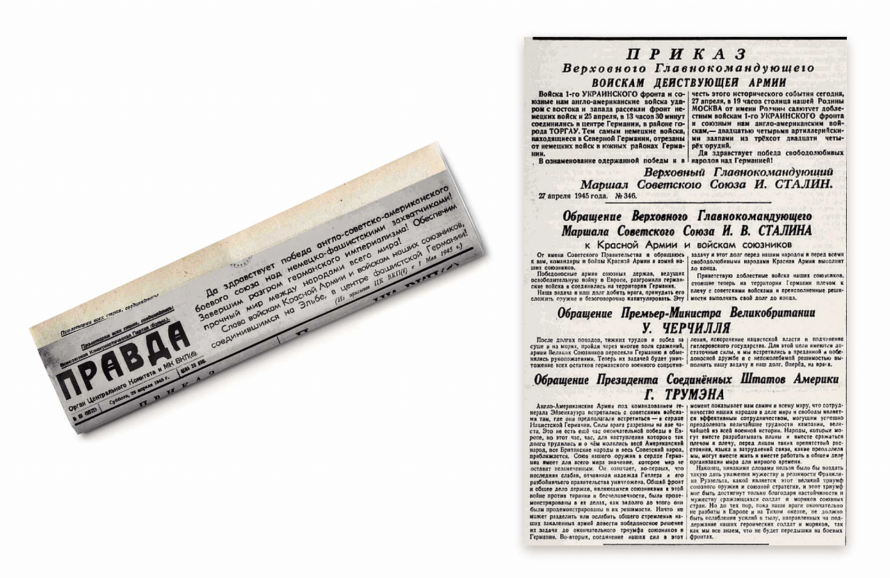 25 апреля 1945 года бойцы 1‑го Украинского фронта под командованием Ивана Конева и американской 12‑й группы армий под командованием генерала Омара Брэдли встретились. Если быть точными, встреч между союзниками было несколько и в разных местах, но официальная, попавшая в учебники и сводки фронтовых корреспондентов, одна. Около 16:00 командир взвода 58‑й стрелковой дивизии 1‑го Украинского флота лейтенант Александр Сильвашко и командир разведгруппы 69‑й американской пехотной дивизии лейтенант армии США Уильям Робертсон взобрались на полуразрушенную переправу через Эльбу и пожали друг другу руки.