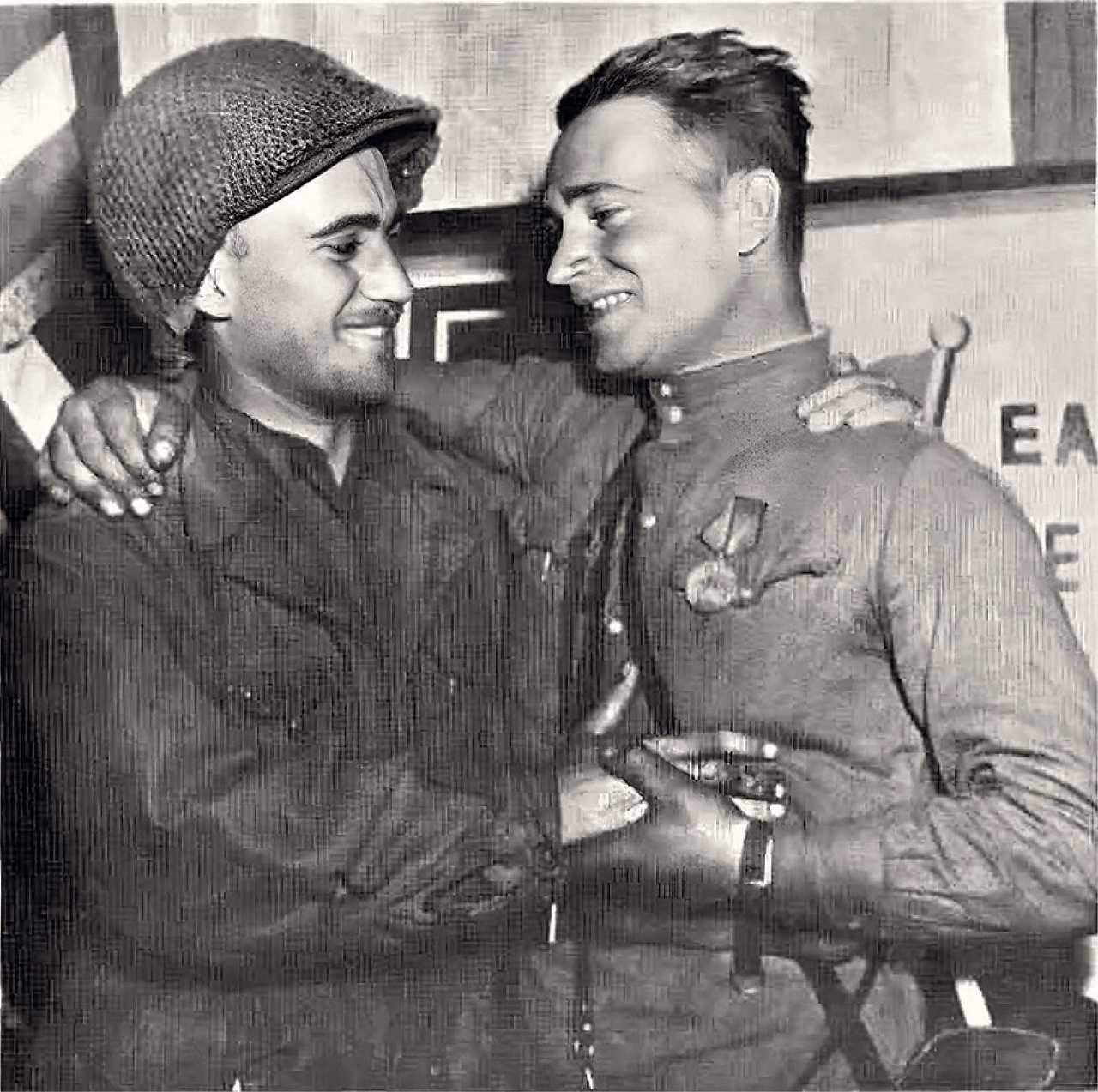Все мы были очень взволнованы. Американские солдаты уважительно рассматривали наши гвардейские знаки, ордена и медали, спрашивали их названия, интересовались, что это за красные и желтые нашивки на гимнастерках, и, узнав, что это знаки о ранениях, с восхищением говорили о героизме наших солдат. Тут же, на лужайке, были расстелены плащ-палатки, выставлены русская водка и нехитрая закуска. И наши, и американские солдаты провозглашали тосты за то, чтобы никогда не было войны, за дружбу, скрепленную кровью в борьбе с общим врагом, за мир.