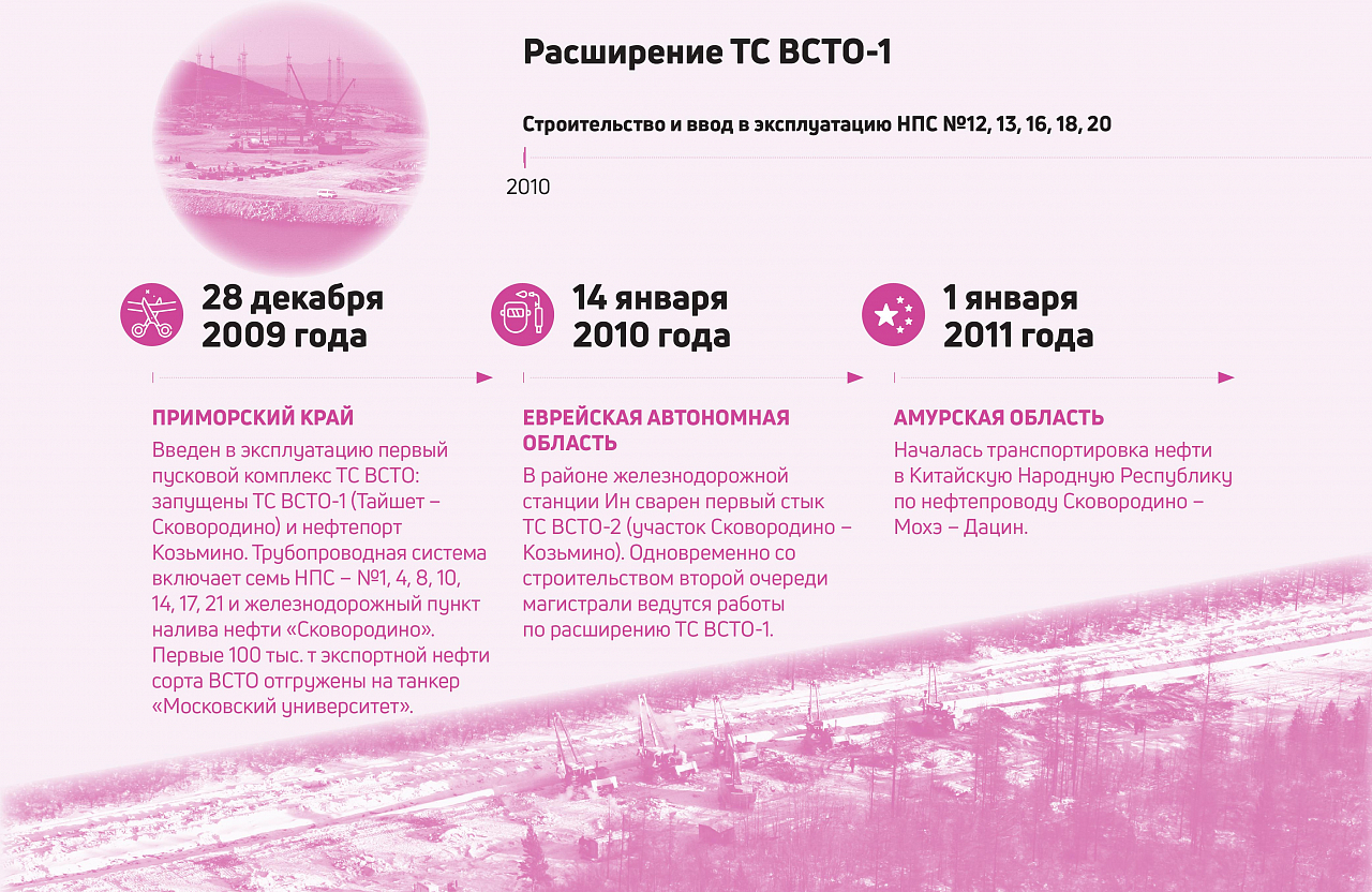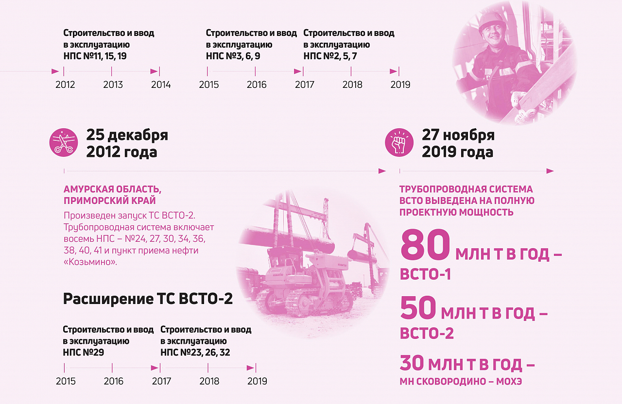 Параллельно строительству и расширению ТС ВСТО прокладывались магистрали Заполярье — Пурпе — Самотлор и Куюмба — Тайшет, которые позволили направить в новую трубопроводную систему дополнительные объемы нефти с месторождений Ямала и севера Красноярского края. К концу 2019 года все работы по увеличению производительности были завершены. 27 ноября в эксплуатацию были введены последние станции расширения — НПС № 2, 5, 7 на ВСТО-1 и НПС № 23, 26, 32 на ВСТО-2. Нефтепровод ВСТО достиг проектных мощностей на всей своей протяженности: 80 млн т в год на участке ВСТО-1 (Тайшет — Сковородино) и 50 млн т в год на участке ВСТО-2 (Сковородино — Козьмино). Это было сделано на десять лет ранее запланированных сроков.