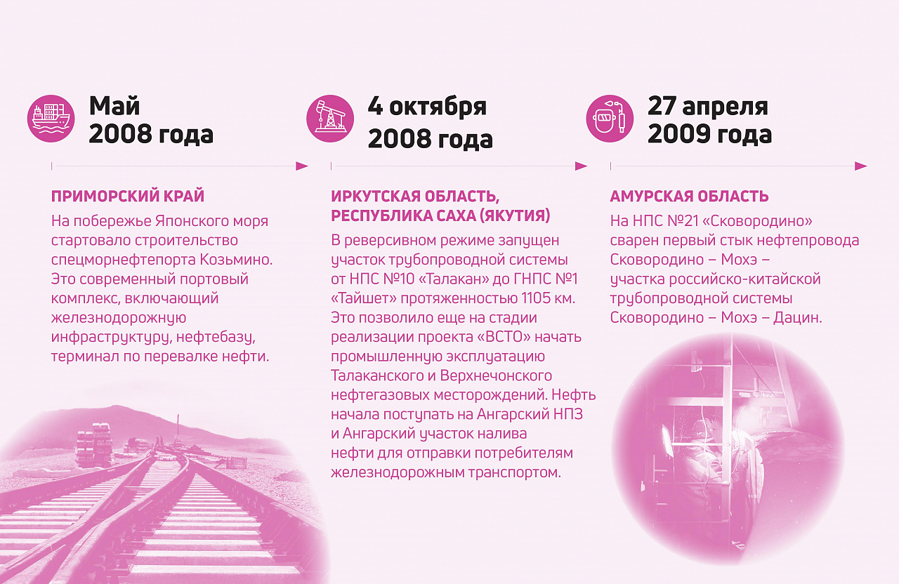 Наполнен событиями был и 2008 год. В районе Тайшетской НПС к трубопроводной системе был подключен первый участок нефтепровода до НПС № 10 «Талакан». В апреле ТС ВСТО приняла первую нефть. Еще на первых стадиях проекта было принято решение, что работать нефтепровод начнет до полного завершения строительства. В октябре 2008 года нефтепроводчики приступили к реверсивной перекачке на участке Талакан — Тайшет. Поставки шли на Ангарский НПЗ, а также на Ангарский участок налива в Мегете, откуда нефть по железной дороге отправлялась потребителям. Это решение позволило запустить в промышленном режиме два крупнейших нефтегазовых месторождения Якутии. За время эксплуатации участка в реверсивном режиме было транспортировано 2 млн т нефти: 1,3 млн т с Талаканского месторождения и 0,7 млн т с Верхнечонского.