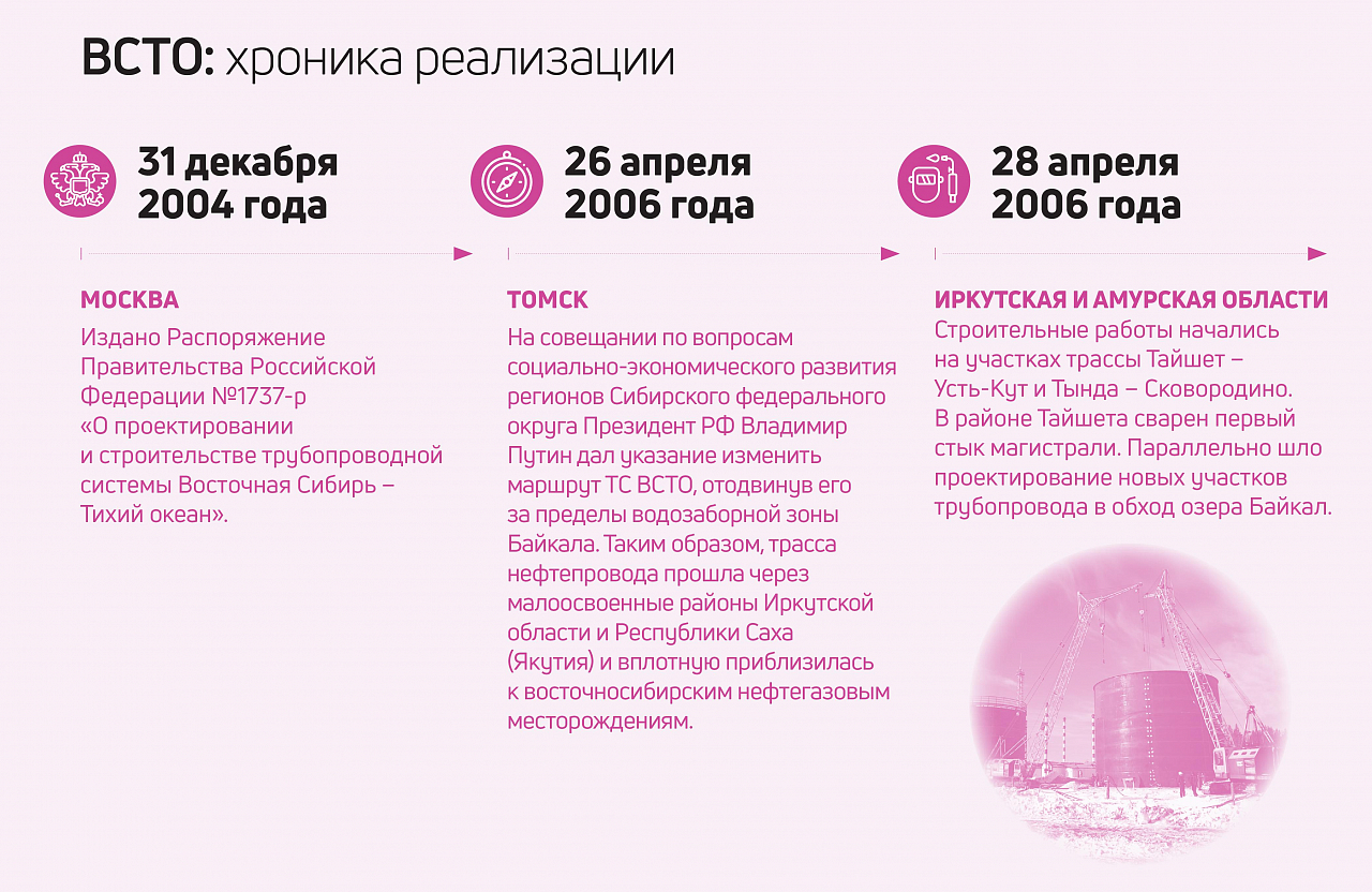 28 апреля 2006 года в районе Тайшета был сварен первый стык новой магистрали. А двумя днями ранее произошло событие, которое полностью изменило ход проекта. На совещании с сибирскими губернаторами в Томске президент страны Владимир Путин поддержал ученых-экологов и предложил максимально отодвинуть нефтепровод от озера Байкал.