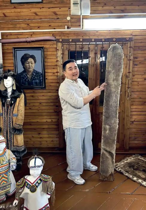 Туда, в Иенгру, мы и направились дальше. Селу в этом году исполняется 100 лет. Зашли в музей с уникальными экспонатами, полюбовались на чудодейственный шаманский бубен и украшения. Перед входом в школу для нас провели эвенкийский обряд «Икэнипкэ» (подражание жизни), направленный на очищение от всего (понимаю, хотелось бы больше конкретики в этом месте, но, раз нам было сказано «от всего», нет повода не верить).