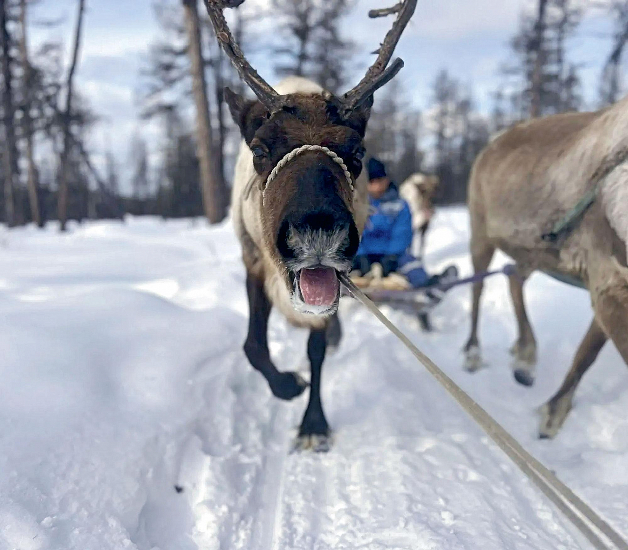 Ощущение полета над снежной равниной, невольно вспоминаешь Деда Мороза или Санту. Таежный воздух и силуэты животных завораживают. Кажется, что мы перенеслись в другое измерение, далекое от городской суеты. Это зимовье, стоянка родовой общины кочевников. Они коренные жители Якутии, эвенки.