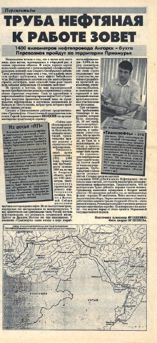 В самом начале 2000-х годов «Транснефть» активно взялась за продвижение проекта нефтепровода на Дальний Восток. По документации трасса шла по маршруту Ангарск — Казачинская — Тында — Хабаровск — Перевозная, ее протяженность составляла около 3900 км. Проект назывался «Нефтепровод для транспортировки российской нефти в страны Азиатско-Тихоокеанского региона». Период строительства определялся в шесть лет, с 2002 по 2008 год. В то время я работал заместителем главного инженера ОАО «Транссибнефть» — впоследствии АО «Транснефть — Западная Сибирь».
