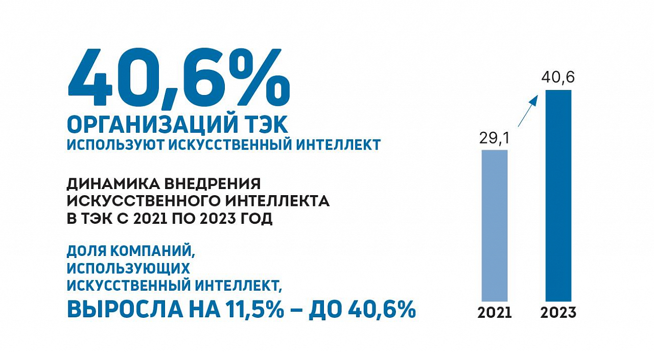 Э.Ш.: В целом в топливно-энергетическом комплексе наблюдается высокая динамика внедрения ИИ. Только за период с 2021 по 2023 год доля компаний, использующих искусственный интеллект, выросла на 11,5% — до 40,6%. Прогнозируется, что в 2024 и 2025 годах такая динамика сохранится, так как инвестиции в использование этой технологии, в том числе в НИОКР, продолжают расти. Наращивание темпов внедрения искусственного интеллекта позволит эффективнее использовать ежедневно генерируемые объемы данных, которых в нефтегазовой отрасли кратно больше, чем в других отраслях.