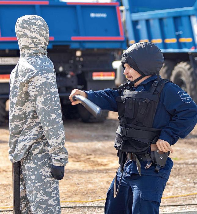 Еще одно упражнение — на обеспечение пропускного и внутриобъектового режимов: по легенде, условные нарушители пытаются пронести на КПП запрещенные предметы, которые необходимо увидеть с помощью металлодетектора и обнаружителя взрывчатых веществ. Последнее приспособление — новшество этого года, до этого манекенов-нарушителей досматривали только металлодетектором. Там же на КПП проходит осмотр автотранспорта — в грузовой автомобиль заложена имитация взрывного устройства, которое нужно обнаружить за определенное время. Упражнение по спецподготовке — настоящий квест: на участке 50×40 м, имитирующем линейную часть, участник должен отыскать следы изготовления несанкционированных врезок. Для этого он запускает квадрокоптер и самостоятельно управляет им (это второе новшество конкурса). На воздушный осмотр отводится не более пяти минут, после чего конкурсант выдвигается на участок и в течение 10 минут ищет признаки преступления уже на земле.