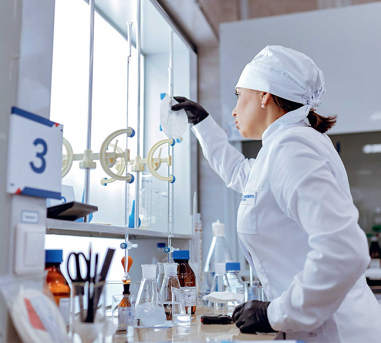 — Четкие движения, ни шагу лишнего. Два часа на ногах при определении концентрации хлористых солей. Самое трудное — не пропустить специально наклеенные этикетки с просроченным сроком годности реактивов, аккуратно обращаться с серной кислотой, а затем уловить точку эквивалентности — когда титрант добавляется в водную вытяжку и момент изменения окраски раствора в розовый оттенок. И вы попробуйте точно измерить объем дистиллированной воды в цилиндре, увидеть уровень — надо не наклониться, а присесть перед столом, — элегантно демонстрирует отточенные движения победительница номинации.