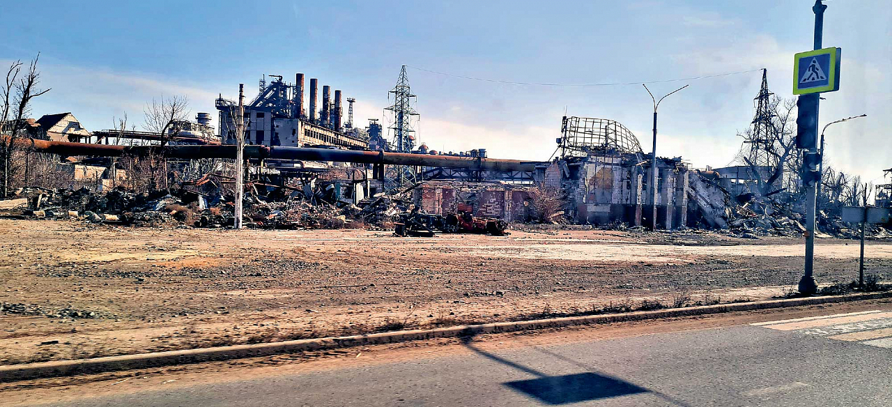 В начале путешествия мы заехали в Мариуполь, где остановились около завода «Азовсталь», вернее, того, что осталось от этого когда-то крупнейшего на Украине металлургического предприятия. Гигантское предприятие, где в начале СВО прятались боевики запрещенной в РФ террористической организации «Азов». После зачистки от террористов восстановлению производство не подлежит. По сути, остались руины.