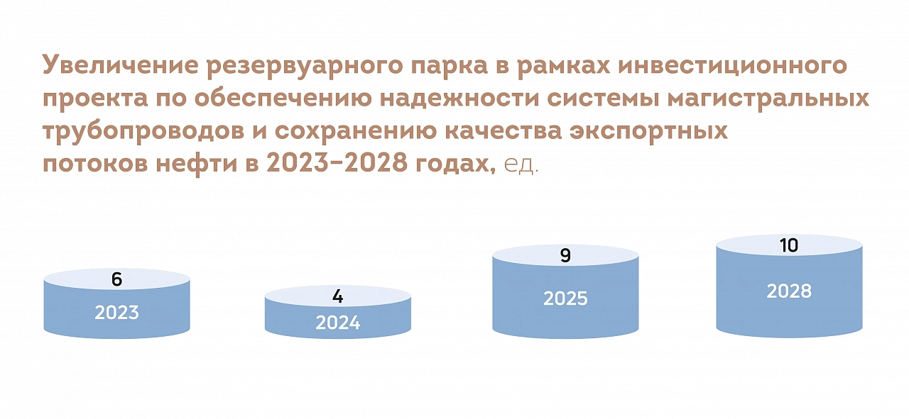 В АО «Транснефть — Сибирь» началось строительство шести резервуаров объемом 20 тыс. м3 каждый, а в АО «Транснефть — Прикамье» — одного пятидесятитысячника. Ввод в эксплуатацию этих емкостей запланирован в 2025 году.
