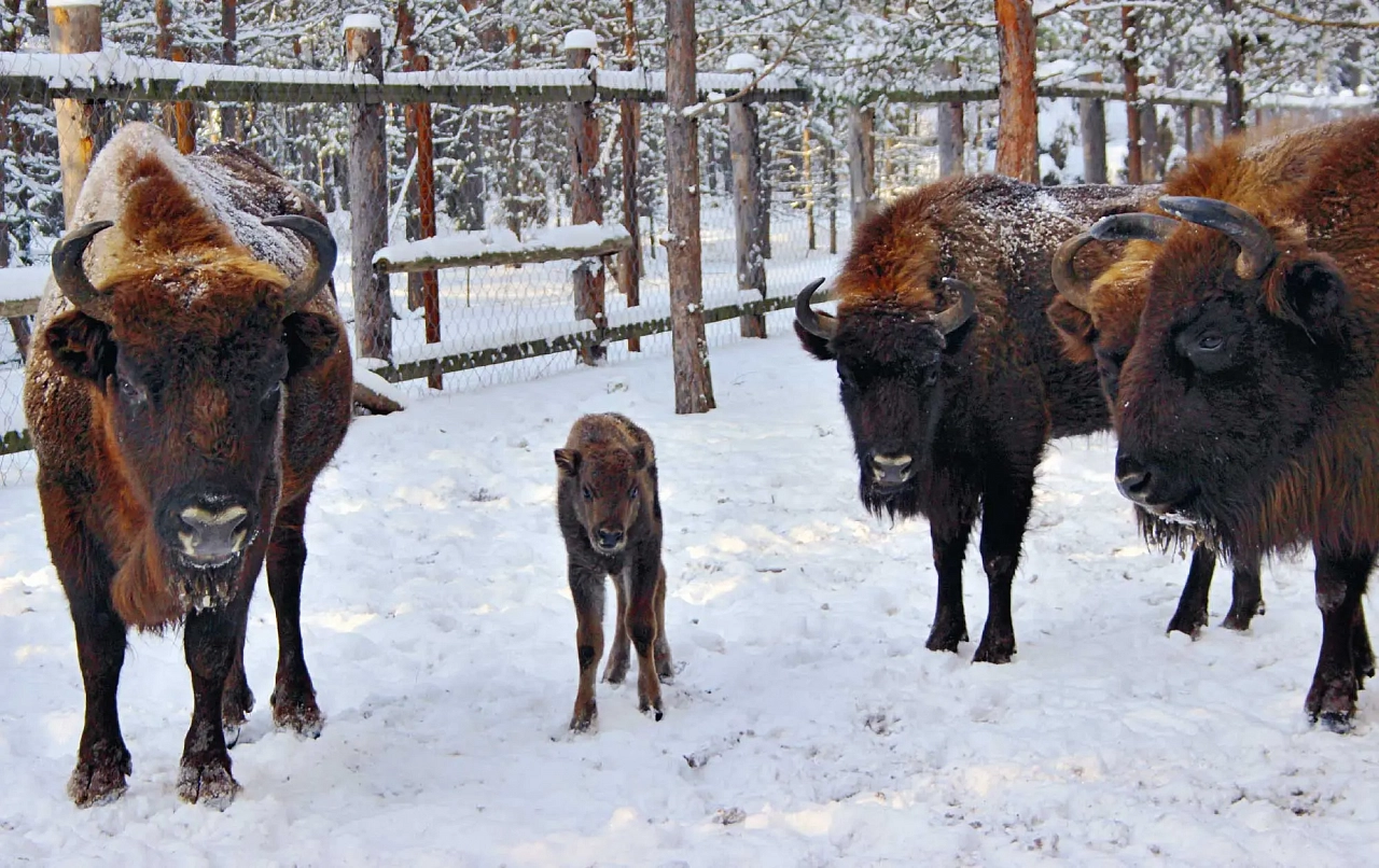 В вольерном комплексе мы подкармливаем зубров круглый год, а в вольной популяции — только зимой. Кроме зерна и сена выкладываем капусту и морковь, заготавливаем веники из молодых побегов березы и крапивы. Но животные добывают пищу и самостоятельно — разгребают копытами снег, едят ветки и остатки травы. Сугробы этим гигантам не помеха. При хорошей кормовой базе зубры успешнее размножаются. Отел происходит весной или осенью, и мы будем очень ждать приплода и в следующем году.
