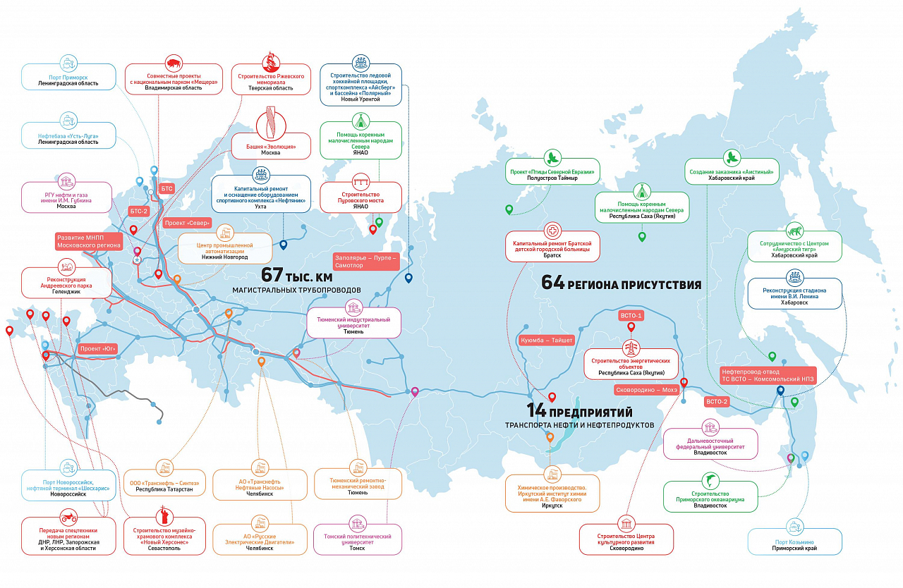 Десятки тысяч километров трубопроводов «Транснефти» протянулись по территории России. Крупнейшая в мире трубопроводная компания не только реализует масштабные инвестиционные проекты, но и встроена в социальную жизнь регионов своего присутствия, старается делать мир вокруг совершеннее. Спектр направлений ее деятельности широк и разнообразен — это строительство дорог и мостов, помощь образовательным и медицинским учреждениям, сотрудничество в сфере культуры, искусства и спорта, охрана природы. Перечислить все проекты «Транснефти» невозможно. «ТТН» представляет на карте страны наиболее значимые из них.