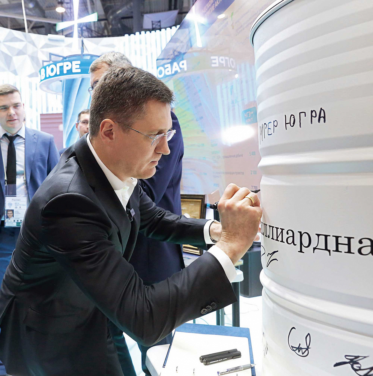 На стенде ХМАО‑Югры заместитель Председателя Правительства РФ оставляет автограф на бочке с частью 13‑миллиардной тонны добытой здесь нефти. Дальше — стенд Иркутской области, где начинались экспедиции по освоению дальних территорий. В Приангарье берет свое начало нефтепровод ВСТО.