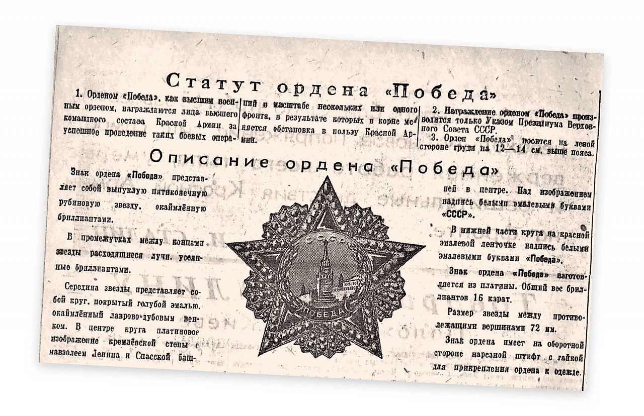 - Первыми орденом «Победа» 10 апреля 1944 года были награждены маршалы Советского Союза Георгий Жуков и Александр Василевский