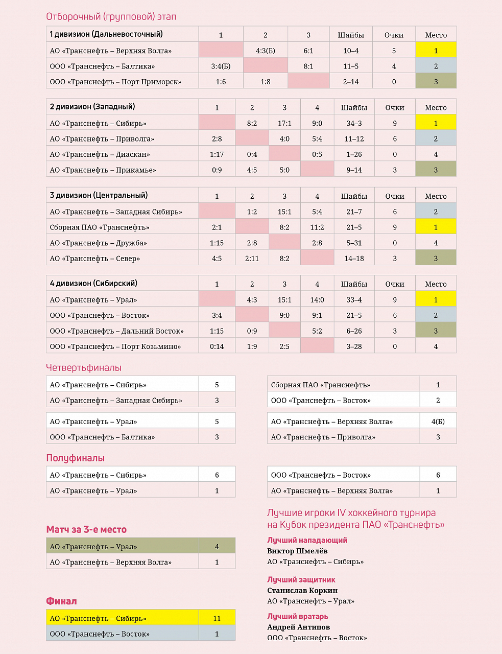 Особое внимание приковано к хозяйке турнира — дружине АО «Транснефть — Западная Сибирь». В финал они не вышли, но какую зрелищную игру показали. Нечетов и Писанко, Майер и Горбоносов — фамилии не раз произнесенные комментатором, запомнила вся система. Как и шоу, которое разворачивалось на льду. 15:1 — их рекорд в матче с дружиной АО «Транснефть — Дружба». Но запомнится не менее впечатляющим голом престижа от проигравшей команды.