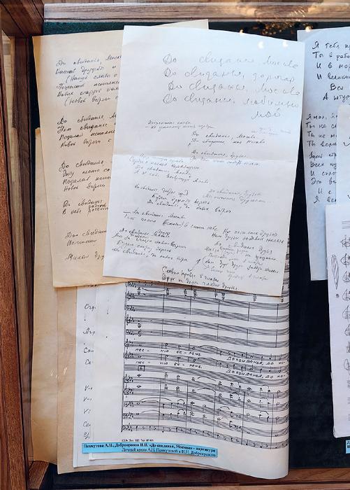 По рукописям можно проследить весь творческий путь произведений. Например, стихи к «Мелодии» рождались сложно. В черновиках Николая Добронравова множество исправлений убористым почерком. Так, слова «Ты — моя Вселенная» позже были заменены на более лиричные и менее шаблонные «Ты — моя Мелодия». Непросто было и с композицией «До свидания, Москва!» — много правок, много версий. По сути, это был госзаказ к Олимпиаде‑80, предполагающий патетику и патриотические лозунги. Но Пахмутова и Добронравов смогли написать песню, под которую плакал весь стадион, а олимпийское звонкое эхо осталось в стихах и сердцах.