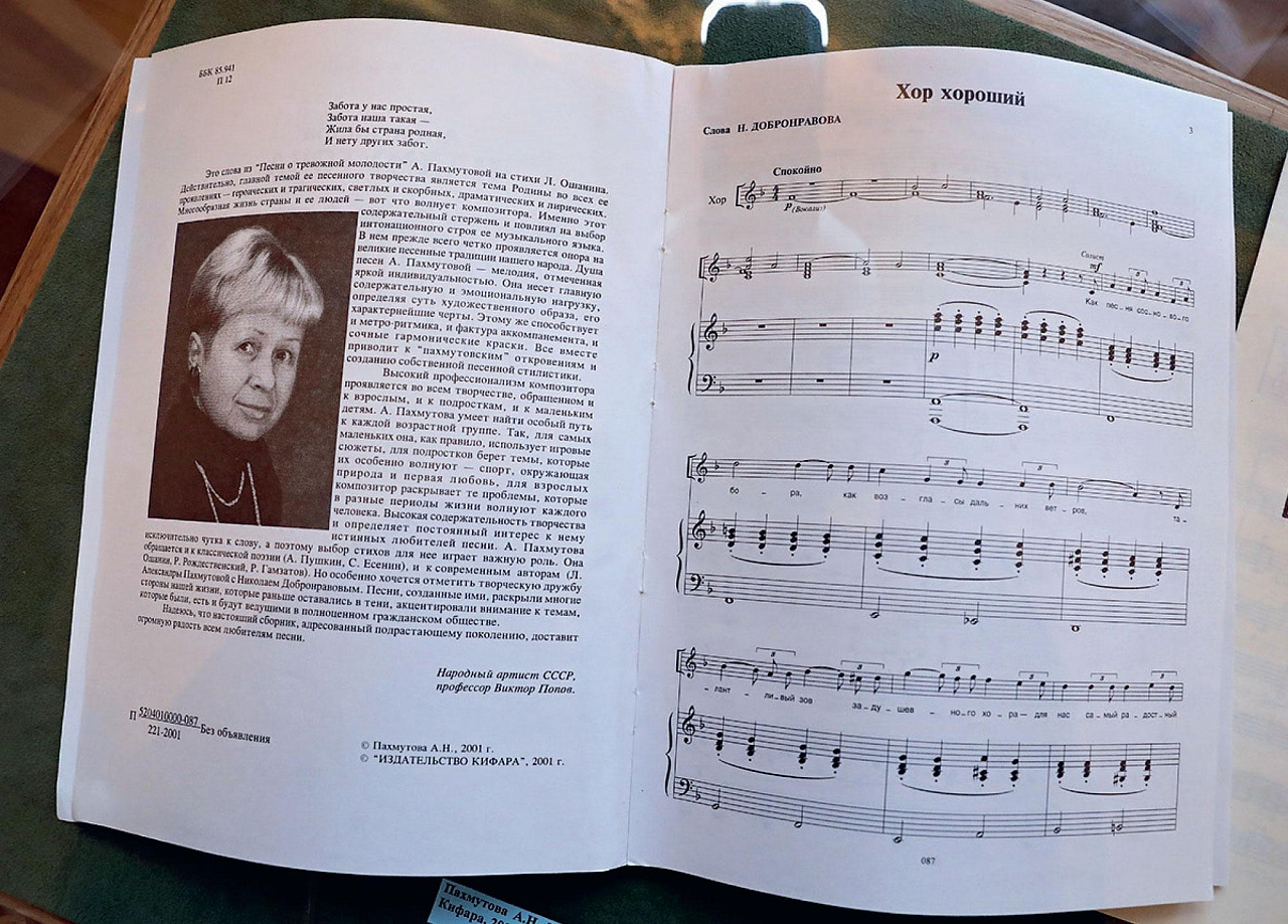 В Доме Пашкова наряду с рукописями была представлена и фотохроника. Внимание привлекает забавный снимок, где поэт Сергей Михалков ростом под 190 см стоит рядом с миниатюрной Пахмутовой (149 см). Юрий Гагарин, Алексей Леонов, Майя Плисецкая, Юрий Никулин, Валерий Гергиев… На кадрах лишь малая часть людей, с которыми дружили Добронравов и Пахмутова. Первой с фотовыставкой ознакомилась, конечно, сама композитор, а потом побывала на концерте в свою честь с символическим названием — «Наши песни — наша благодарность людям». На нем выступали и именитые оперные певцы, и юные звездочки из Большого детского хора имени В. С. Попова.