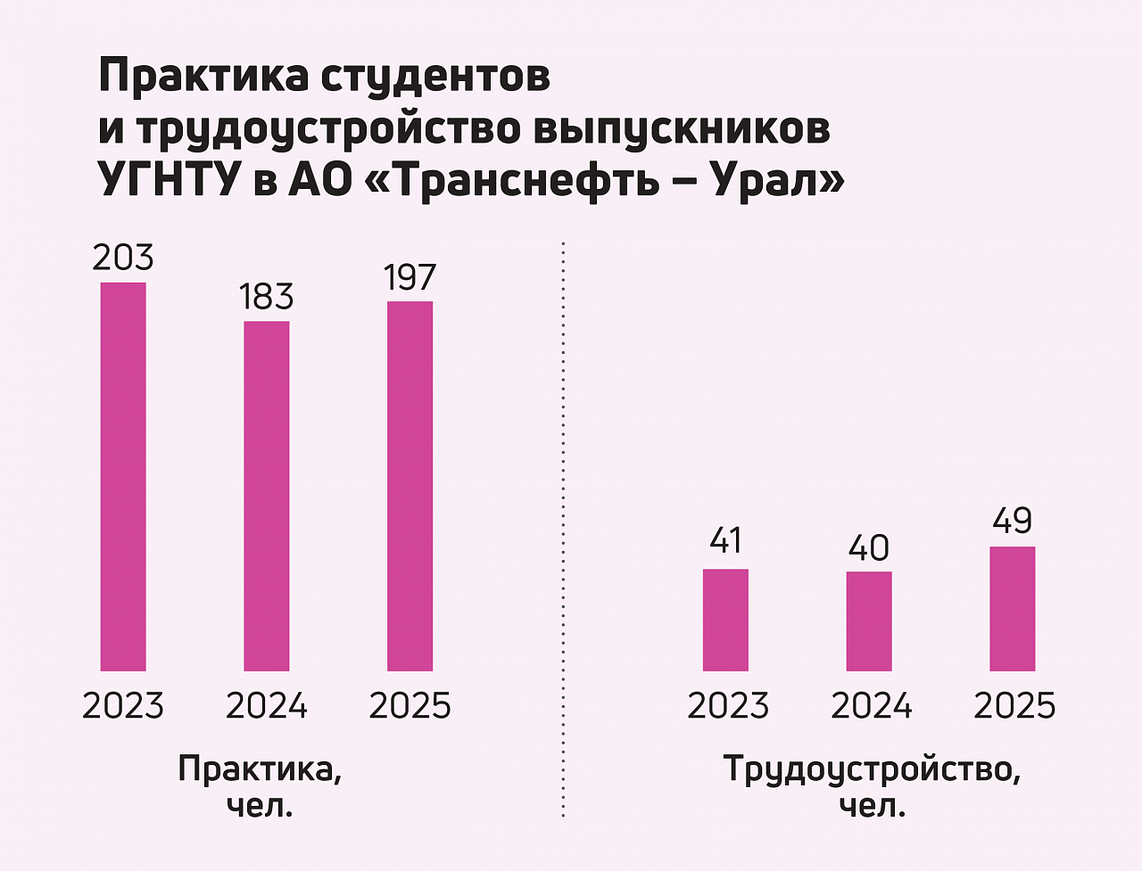 «Транснефть» в свою очередь делает все необходимое для развития факультета. При поддержке компании в УГНТУ создана целая сеть отраслевых лабораторий и аудиторий, студенты проходят производственную и преддипломную практику на объектах предприятия, участвуют в Международной научно-технической конференции молодежи и защищают в АО «Транснефть — Урал» дипломные работы. 17 лучших студентов получают корпоративные стипендии «Транснефти», а 10 преподавателей — сертификаты на социальные выплаты. Ежегодно формируется план совместной деятельности, а на 2024−2028 годы Правлением ПАО «Транснефть» утверждена программа взаимодействия и развития материально-технической базы вузов, согласно которой предусмотрено финансирование УГНТУ в объеме 48,5 млн руб.
