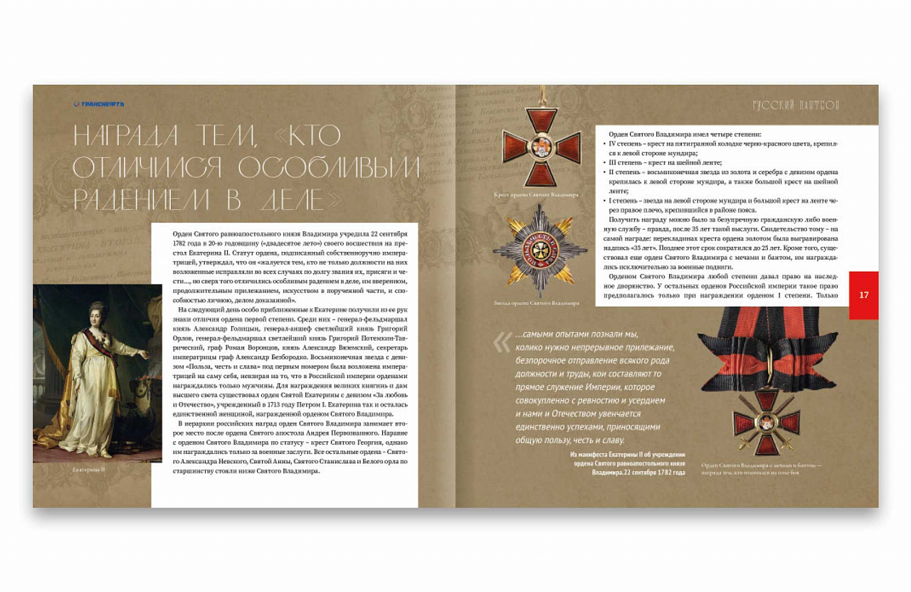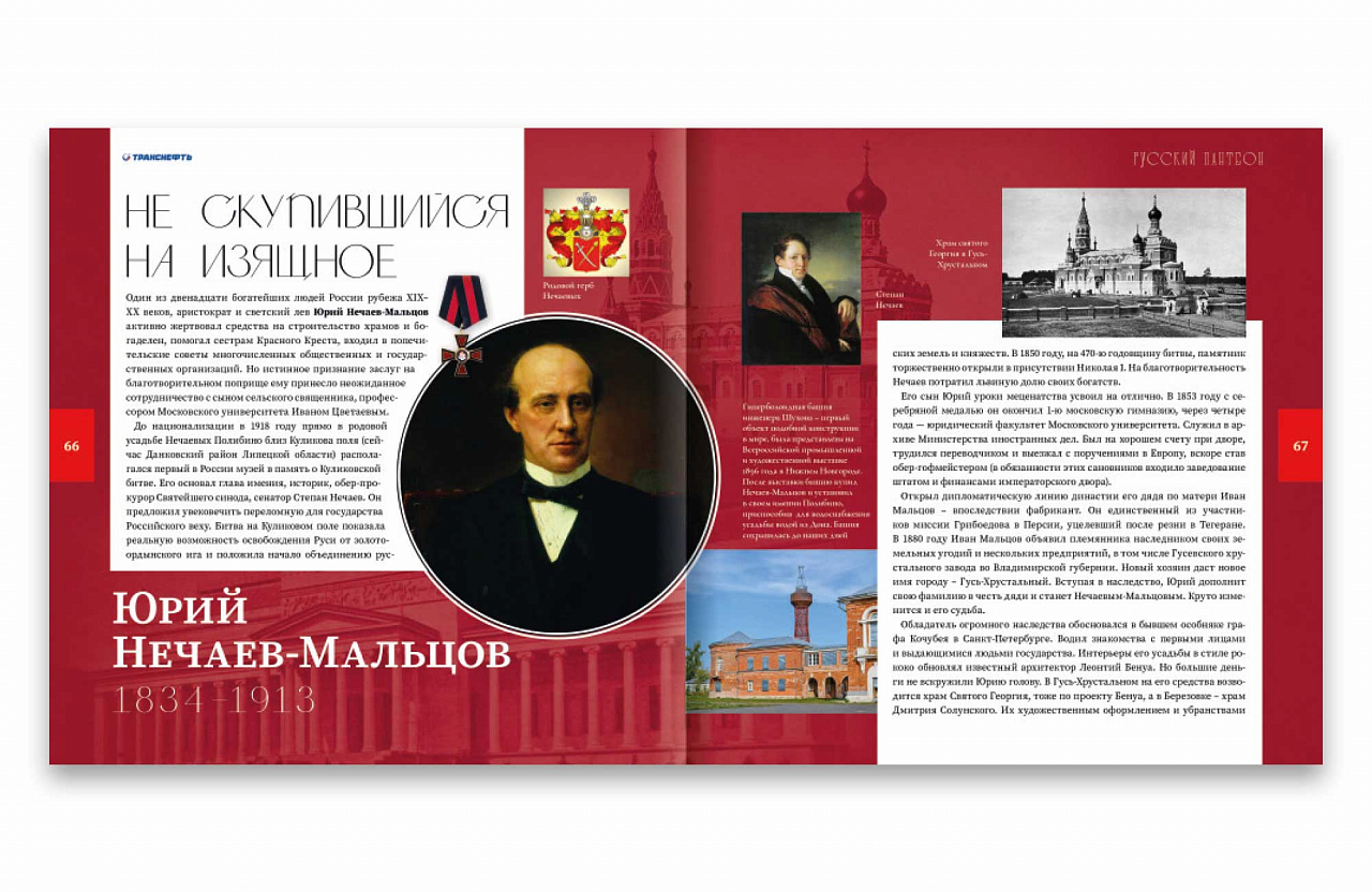 В ближайшее время авторский коллектив ООО «Транснефть — Медиа» готовит к публикации книгу «Русский пантеон. Польза, честь и слава». Это будет двухтомное издание, куда войдут циклы статей о просветителях и ученых, коллекционерах и меценатах, изобретателях и педагогах — тех, кто внес весомый вклад в развитие России. Примечательно, что это люди из самых разных социальных слоев и национальностей. Они были не только русскими. Русский пантеон — это люди с немецкими, шведскими, голландскими, испанскими, украинскими, еврейскими, греческими, турецкими, датскими, польскими, чешскими корнями.