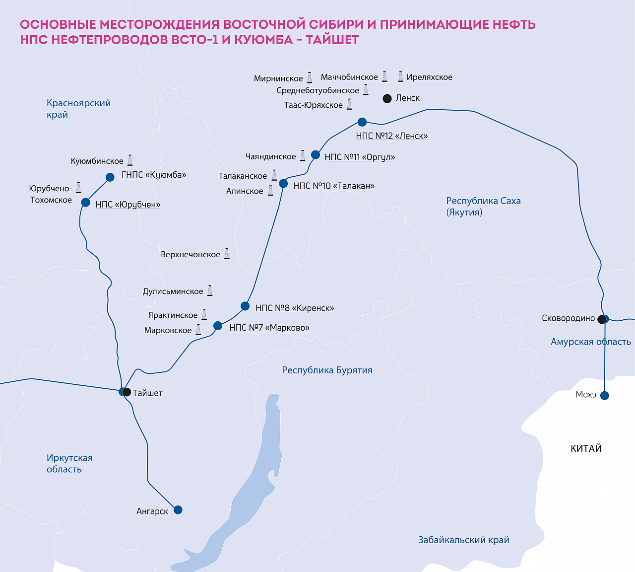 Почти все нефтегазовые месторождения, питающие ТС ВСТО, за исключением двух подключенных к нефтепроводу Куюмба — Тайшет в Красноярском крае, расположены на территории Республики Саха (Якутия) и Иркутской области. Это зона ответственности Ленского РНУ ООО «Транснефть — Восток».