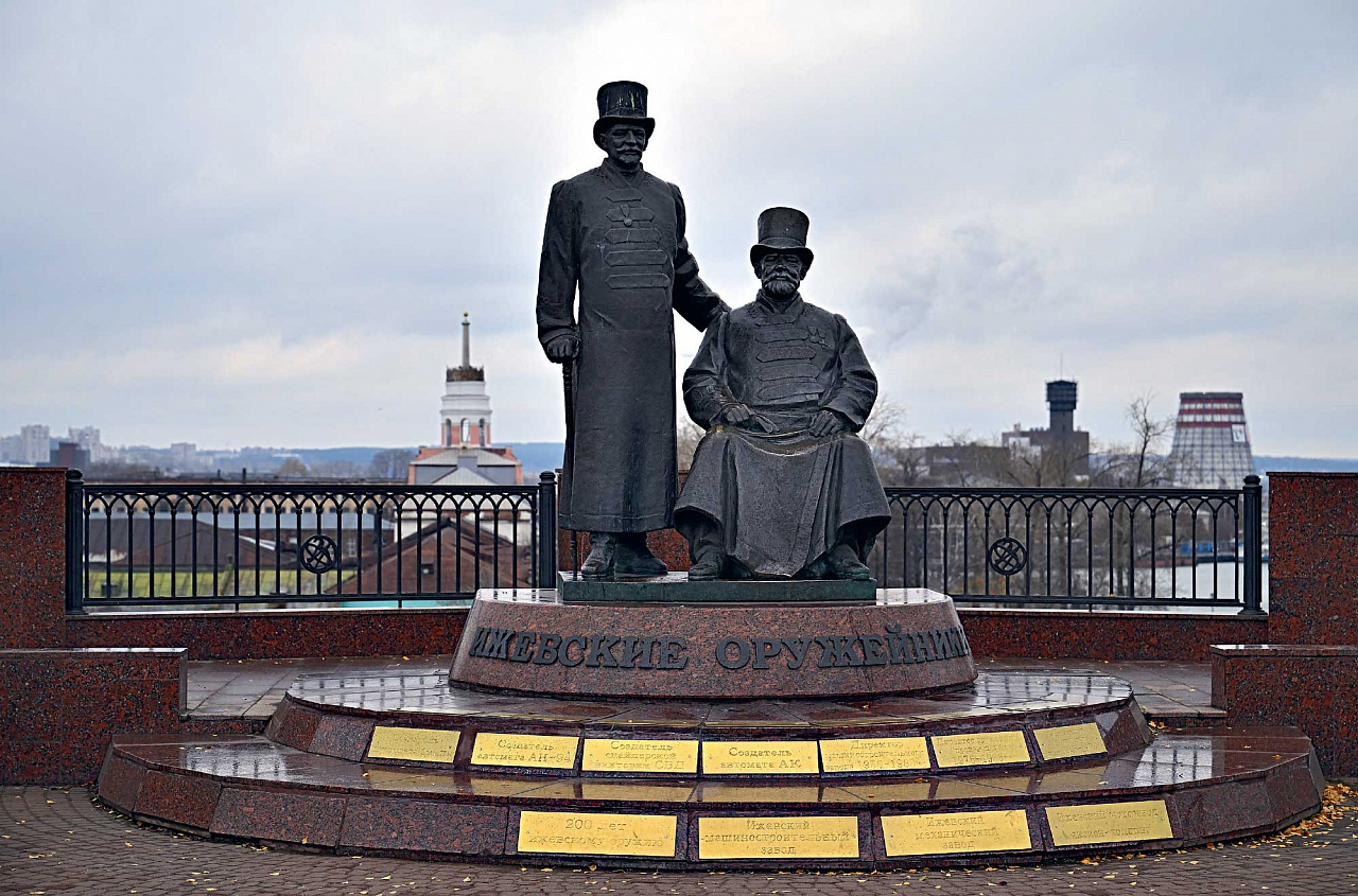 В Ижевске рядом с самым большим в Европе прудом установлен памятник оружейникам, которые облачены в длинные кафтаны, на головах — цилиндры. Такую одежду в царское время жаловали лучшим ижевским мастерам. На гранитном постаменте прибиты таблички с именами оружейников, вошедших в историю России. Среди них и Михаил Калашников. Большая часть жизни этого изобретателя прошла в Ижевске, где выпускался и автомат, и другие виды оружия его конструкции. Последними изобретениями Калашникова стала газонокосилка и механизированная шашлычница, которые он сделал из подручных средств для дачи.