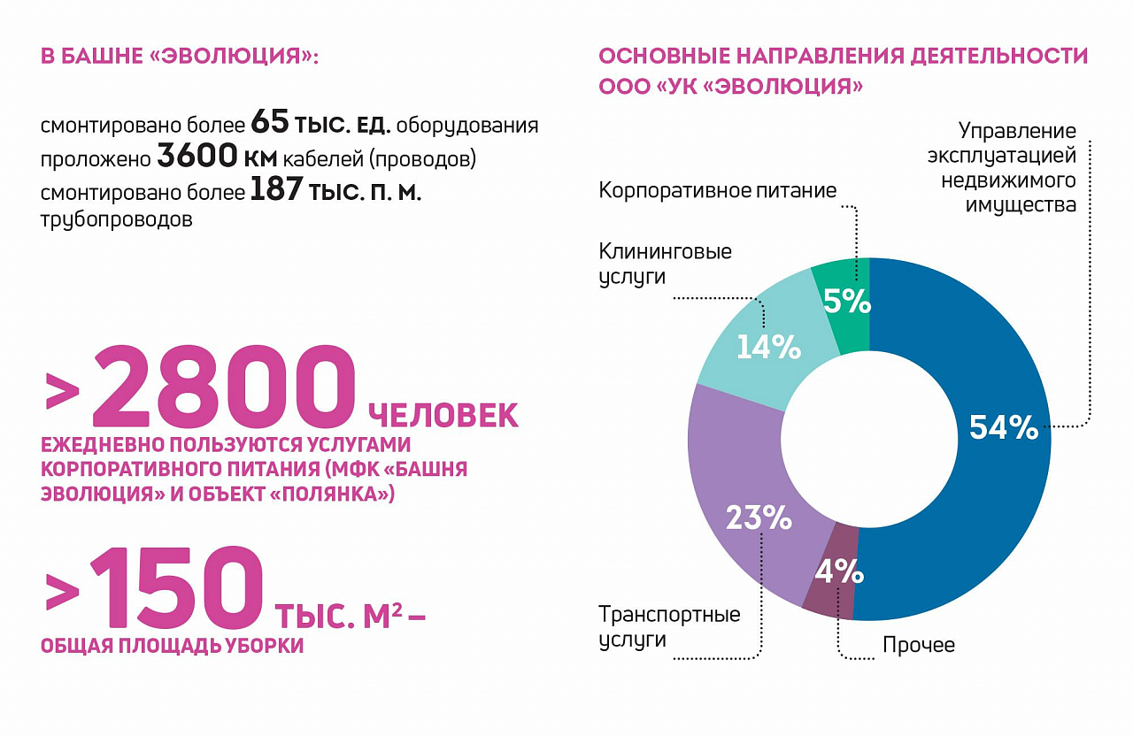 — Основные направления деятельности ООО «УК «Эволюция» — это управление эксплуатацией недвижимого имущества, транспортные и клининговые услуги, корпоративное питание. Вопросы, касающиеся корпоративного питания, занимают особое место в формировании комфортной среды для работников ПАО «Транснефть» и дочерних обществ. Клининговые услуги включают уборку офисных помещений и прилегающей территории, вывоз снега, уход за зелеными насаждениями и дезинфекцию в помещениях, в том числе в период роста инфекционных заболеваний.