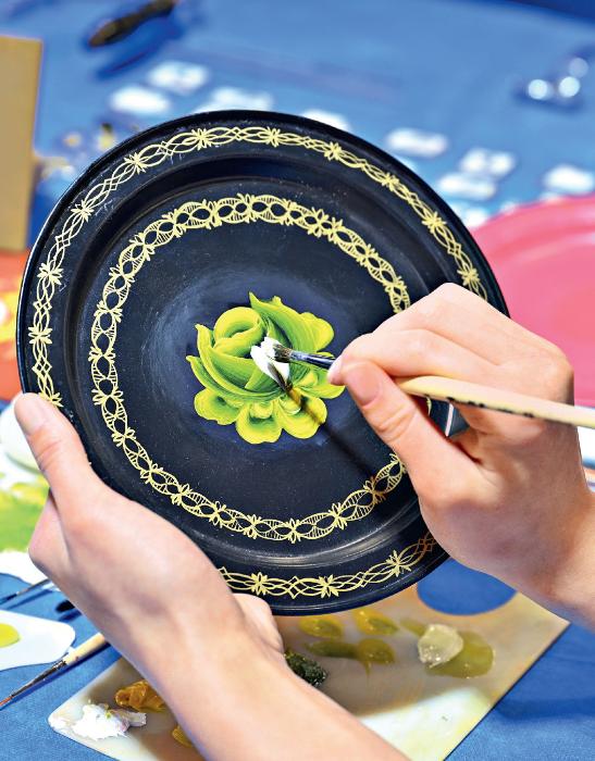 — Городецкая роспись — это знакомая незнакомка. Все вроде бы и слышали про нее, и видели, но она всегда открывается по‑новому, — делится нюансами промысла главный художник ООО «Фабрика Городецкая роспись» Наталья Приваловская. — У нас очень богатая палитра: у меня на рабочем столе только зеленого 14 оттенков! На наших изделиях вы увидите так называемые купавки (элемент цветочного узора. — Ред.), разных животных, чаепития, гуляния, свадебные композиции. Городецкая роспись прекрасно вписывается в современный интерьер.