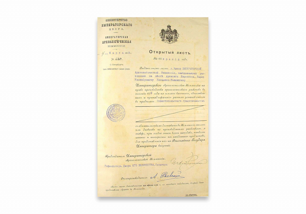 С этого момента археологические работы на территории Херсонеса велись системно под руководством Карла Косцюшко-Валюжинича, который долгие годы писал письма и статьи об упадке и разорении уникальных руин и достучался до самых верхов.