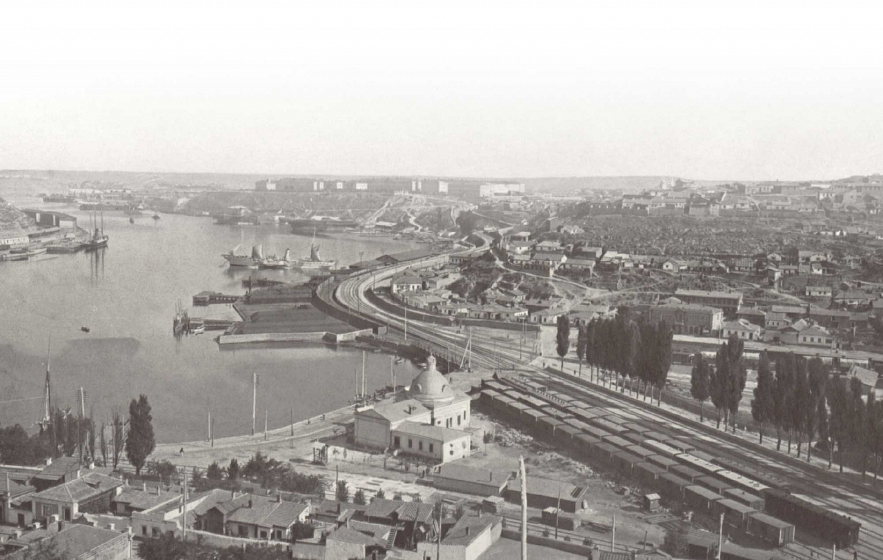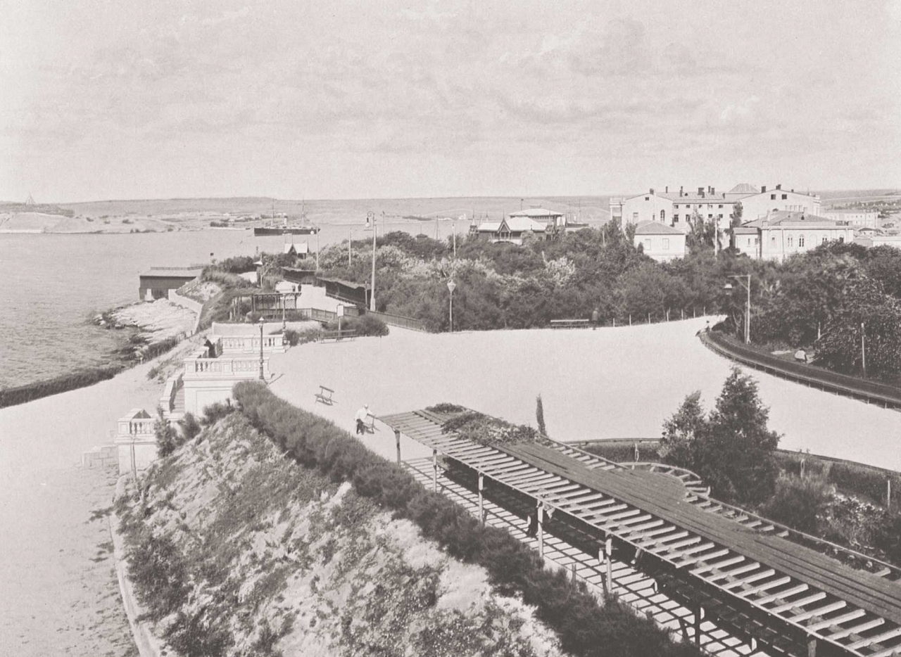 «На расчищенной от мусора площадке возвышается красивый храм во имя Святого Равноапостольного великого князя Владимира. В древности это место было площадью города Херсонеса, и там, где теперь стоит христианский храм, «величественно возвышалось в слепой гордости, — как говорит молодой монах-проводник, — языческое капище идола древних жителей сего, господом разрушенного, града“. „А именовался этот идол богиней Дианой, также называемой Охотницей». Неподалеку от храма Святого Владимира находятся многочисленные постройки монастыря, построенного в 1850 году, монастырская церковь во имя Святой Ольги. Всего земли под монастырем и храмом Святого Владимира — 112 десятин 1477 сажен, и вся эта земля представляет собою археологическую сокровищницу, еще не тронутую и, конечно, уже недоступную для раскопок. За монастырем, по берегу моря, на запад, земля занята сооружениями военно-инженерного ведомства, длинной линией вытянулись батареи, пороховые погреба, стоят пушки, устремив свои стальные пасти в простор моря. Это место, по исследованиям Тунмана и Аркаса, было могильником херсонитов; при сооружении батарей здесь были вырыты надгробные плиты, сосуды из стекла и обожженной глины, в которых ставили в гробницы бальзам, несколько цинковых и глиняных урн с костями, золотых и серебряных украшений, много монет. Таким образом, четыре пятых земли, в высшей степени ценной с научной точки зрения, — утрачено для науки, быть может, навсегда утрачено. Археологическим изысканиям и раскопкам доступна только одна пятая часть Херсонеса, и в данное время ее энергично эксплуатирует заведующий раскопками господин Косцюшко-Валюжинич, наполнивший выкопанными из-под наслоений двадцати веков вещами целый музей, помещающийся тут же, на берегу бухты, и на земле Херсонеса в плохоньком сарайчике. Более ценные добычи науки отправляются в Эрмитаж, монастырь также имеет в своём распоряжении целый чулан, беспорядочно набитый вещами, добытыми из земли во время рытья фундаментов для монастырских построек и храма Святого Владимира. <…>