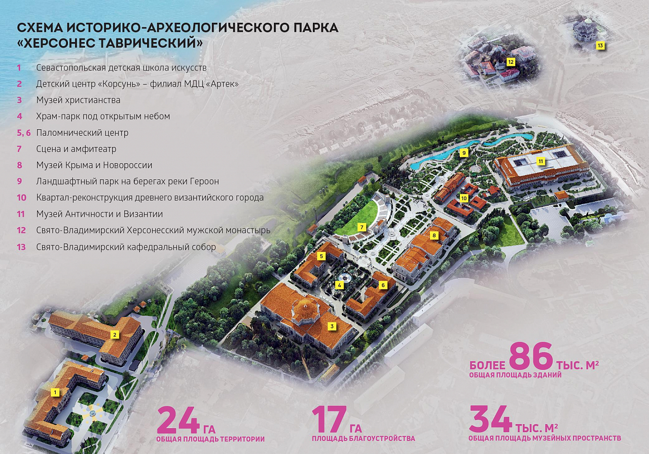 Общая площадь парка составляет более 24 га, площадь зданий — свыше 86 тысяч м2, из которых 34 тыс. м2 занимают непосредственно помещения и пространства музеев. Создан целый комплекс объектов, помимо детского художественного центра и детского центра «Корсунь», который стал филиалом «Артека», созданы сразу несколько музеев — Христианства, Крыма и Новороссии, Античности и Византии, квартал-реконструкция древнего города, храм-парк под открытым небом, античный амфитеатр и многие другие. К примеру, экспозиционные площади в Музее Античности и Византии для размещения музейных экспонатов и артефактов составят порядка 4500 м². Для сравнения до этого года музей-заповедник располагал буквально несколькими залами в бывших монастырских помещениях на 100 и 150 м².