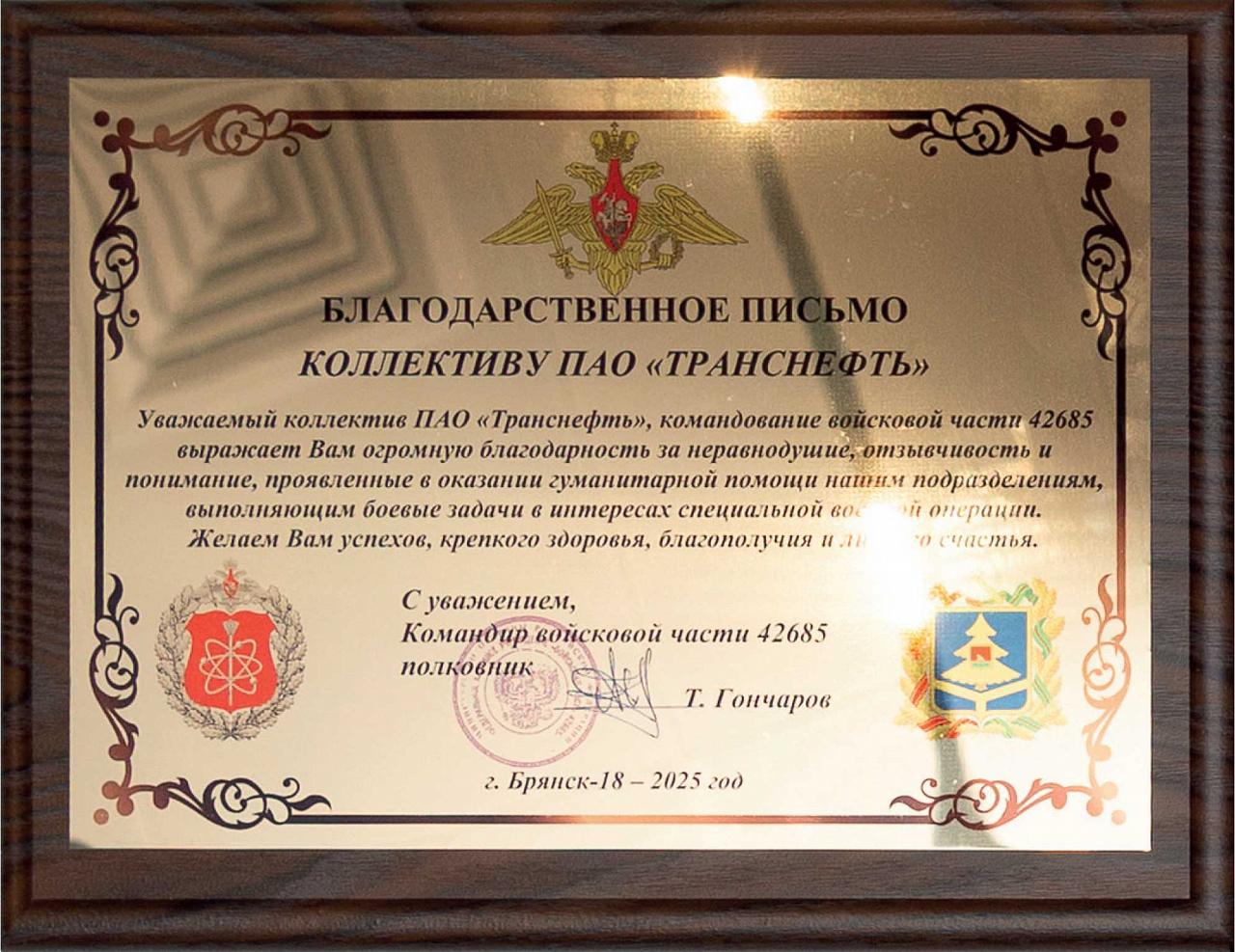 В адрес АО «Транснефть — Западная Сибирь» поступили благодарственные письма от воинских формирований в зоне СВО.