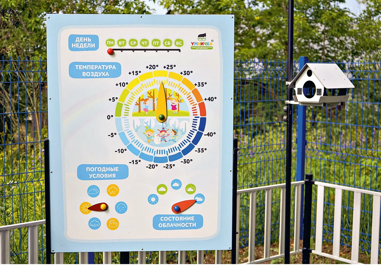 На территории в 2400 м2 благоустроен и полезно использован каждый сантиметр: клумбы с цветами радуют глаз, просторные яркие веранды — спасение от дождя и зноя, современная спортивная площадка с резиновым покрытием, тактильная дорожка и электронный беговой тренажер развивают навыки осязания и интерес к спорту. Готовы к атакам детворы ворота на футбольном поле из резиновой крошки и детский спортивно-игровой комплекс. Собственная метеостанция зовет наблюдать за окружающей средой и экспериментировать. На этом ярком фоне скромнее смотрится только новый тротуар из брусчатки «Кирпичик». Зато четырехлетнему Тимофею Журавлеву нравится проверять на нем прочность велосипедных покрышек.