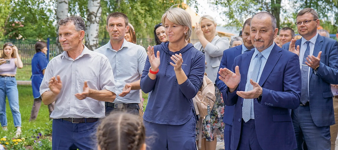 Открытие обновленного детского сада — большое событие и для взрослых: первый ряд слева направо — глава муниципального образования «Селтинский район» Удмуртской Республики Василий Протопопов, заместитель председателя Правительства Удмуртской Республики Ольга Абрамова, заместитель генерального директора АО «Транснефть — Прикамье» по управлению персоналом и общим вопросам Иван Павлов.