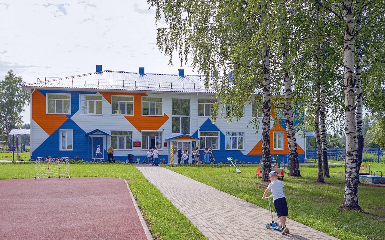 Невзрачное серое здание, как по мановению волшебной палочки, преобразило все вокруг. Фасад обыгран мозаичным рисунком: белый, синий, сочный оранжевый цвета поднимают сельчанам настроение. На крыше здания — флюгер в виде сказочного петушка. Незаметная глазу система видеонаблюдения — по всему периметру детского сада.