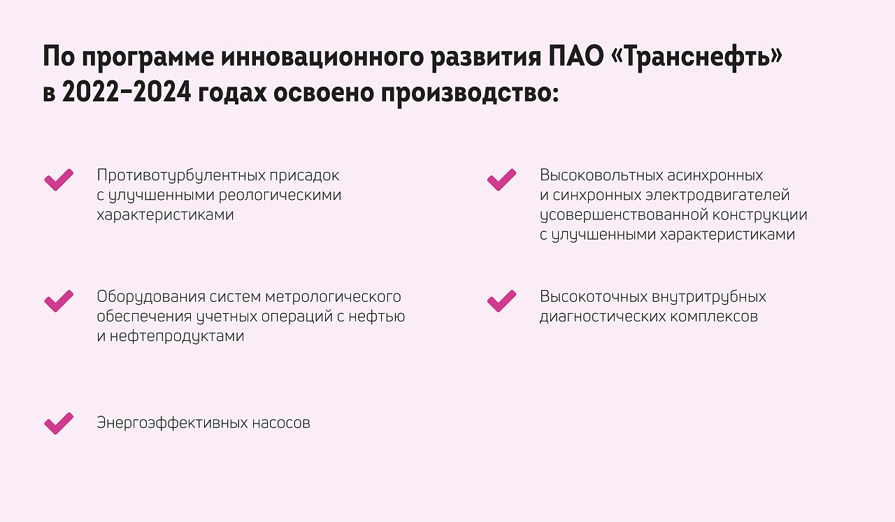 Научные и опытно-конструкторские работы, в том числе с привлечением представителей отраслевой и академической науки, позволили «Транснефти» запустить новые для России производства. Среди них — завод по выпуску противотурбулентных присадок и другие предприятия. Сейчас идет работа по промышленной роботизации и расширению использования информационных технологий, чтобы снизить трудоемкость и повысить эффективность производственных процессов.