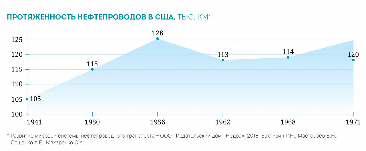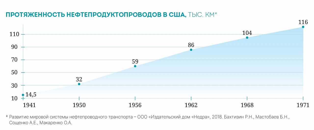 С 1950‑х годов развернулось строительство магистральных нефтепроводов диаметром 500–600 мм большой протяженности. В следующее десятилетие интенсивно развивалась система нефтепродуктопроводов — появились крупные разветвленные сети большой протяженности диаметром 750–900 мм.