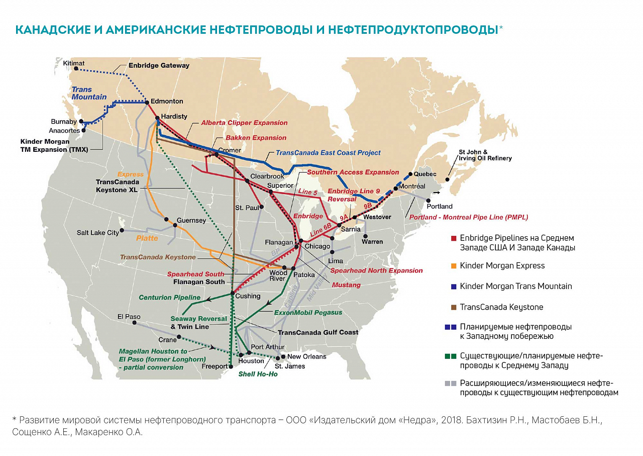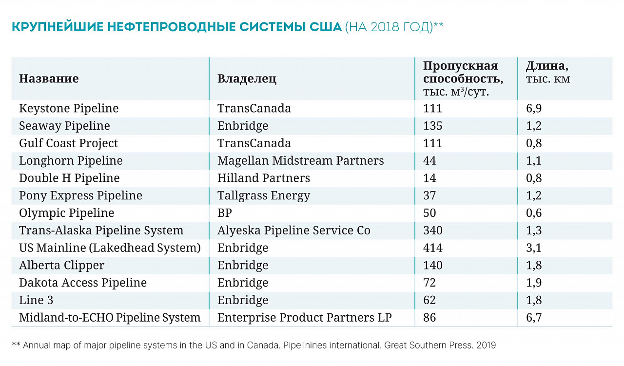 Крупнейшие системы транспортировки нефти из Канады (Lakehead, North Dakota, Sprearhead) находятся в собственности компании Enbridge, их общая протяженность составляет более 5,3 тыс. км, диаметры — от 457 до 1220 мм. Совместно с нефтепроводами компаний ExxonMobil (Mustang, Pegasus) и TransCanada (Keystone Pipeline) сформирована густая трубопроводная сеть, связывающая США и Канаду.