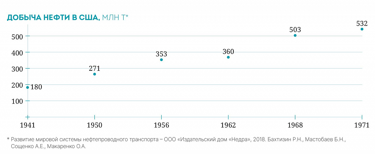 В послевоенное время США переживали стремительный рост потребления нефти, что потребовало увеличения ее добычи в стране и поставок сырья из-за рубежа. Тогда же создаются крупные системы нефтепроводов и нефтепродуктопроводов между штатами.