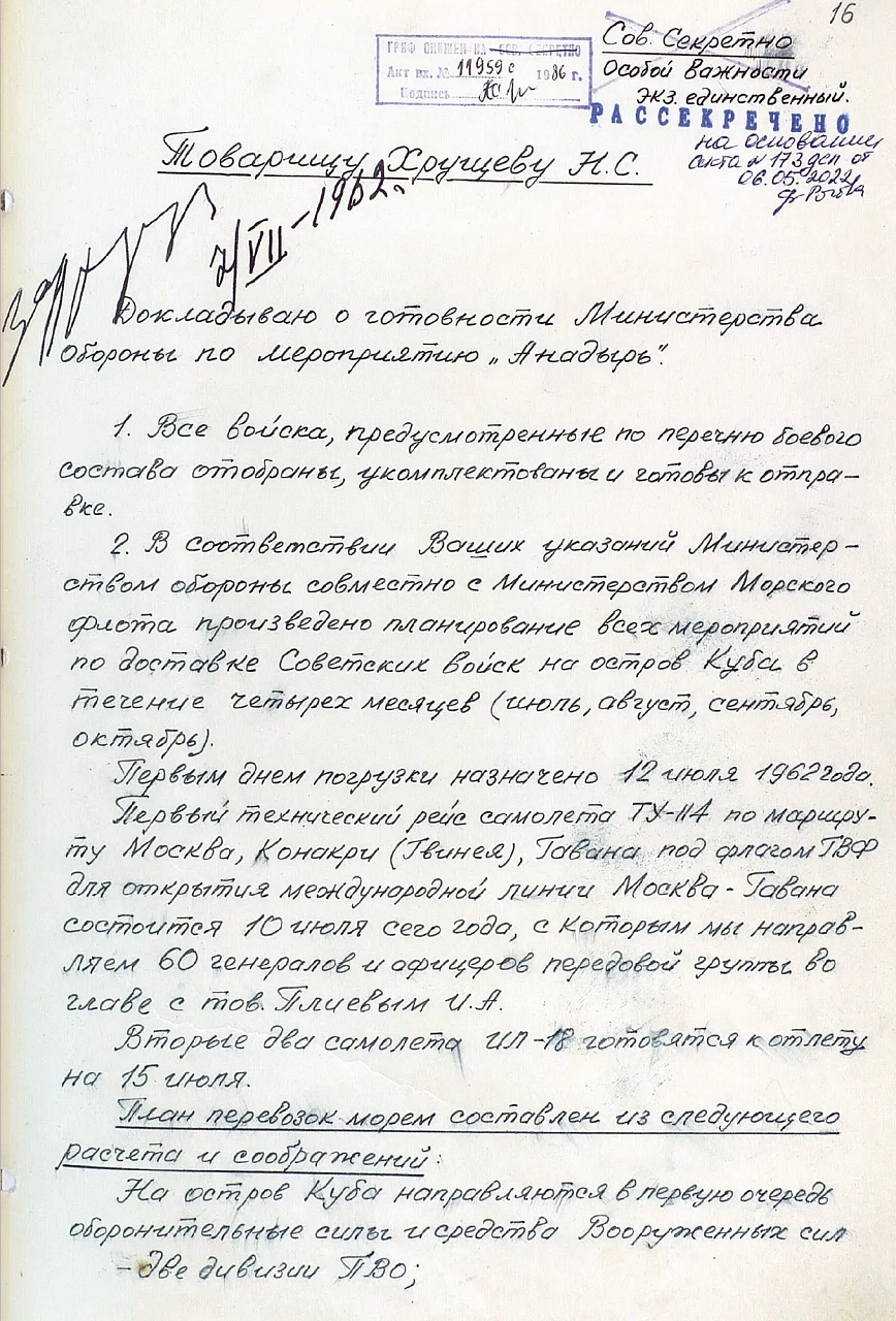 Центральный архив Министерства обороны передал крайне интересные рассекреченные документы по организации операции «Анадырь» и переброске советских военнослужащих, ракет и военной техники на Кубу. Из 44 тыс. человек, которые входили в Группу советских военных специалистов на Кубе, подготовкой к пуску ракет занимались около 8 тыс. Остальные — мотострелки, летчики, моряки, связисты, подразделения обеспечения.Название «Анадырь» было дано для дезориентации противника: в то время на Чукотке тоже строились ракетные площадки. Чтобы замести следы, на корабли, которые следовали на Кубу, загружали лыжи, шапки-ушанки, бушлаты. Гражданские торговые корабли с военными грузами уходили из нескольких советских портов. С одной стороны, в СССР не было такого количества военно-морских судов, чтобы перевезти сразу столько людей. С другой — все делалось в обстановке жесточайшей секретности. Капитаны имели право узнать конечную точку следования лишь на середине пути, когда вскрывали пакет с письмом.