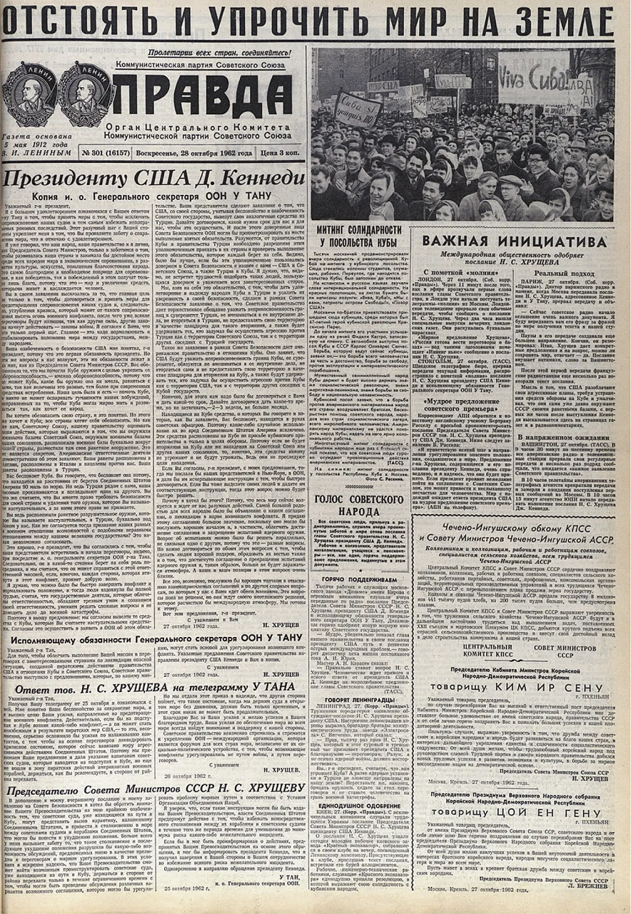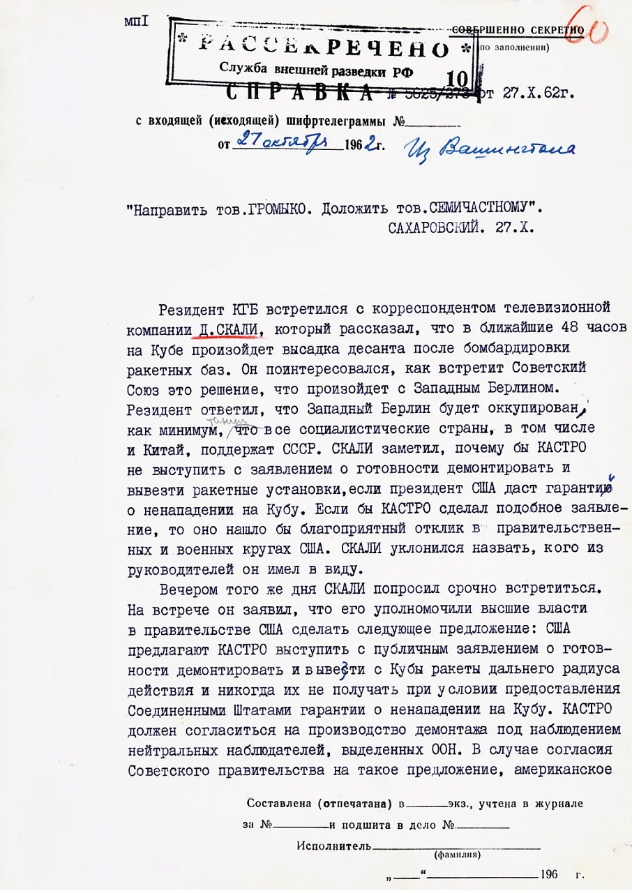 За время Карибского кризиса Хрущев и Кеннеди обменялись двенадцатью посланиями. Через несколько дней после официальных взаимных обвинений руководителей мировых держав, последовали контакты на разных уровнях. Так, во время беседы советского резидента с тележурналистом Джоном Скали, состоявшейся 27 октября 1962 года в Вашингтоне (есть ее расшифровка), прозвучало, что в ближайшие 48 часов на Кубу после бомбардировки ракетных баз будет высажен американский десант. Журналист интересовался, что в таком случае собирается предпринять СССР. Через Скали верховные власти США тем же вечером сделали предложение советскому руководству о том, что если с Кубы будут выведены ракеты, то американцы обязуются не нападать на остров Свободы и ликвидируют военную базу в Турции.Дипломатия Микояна