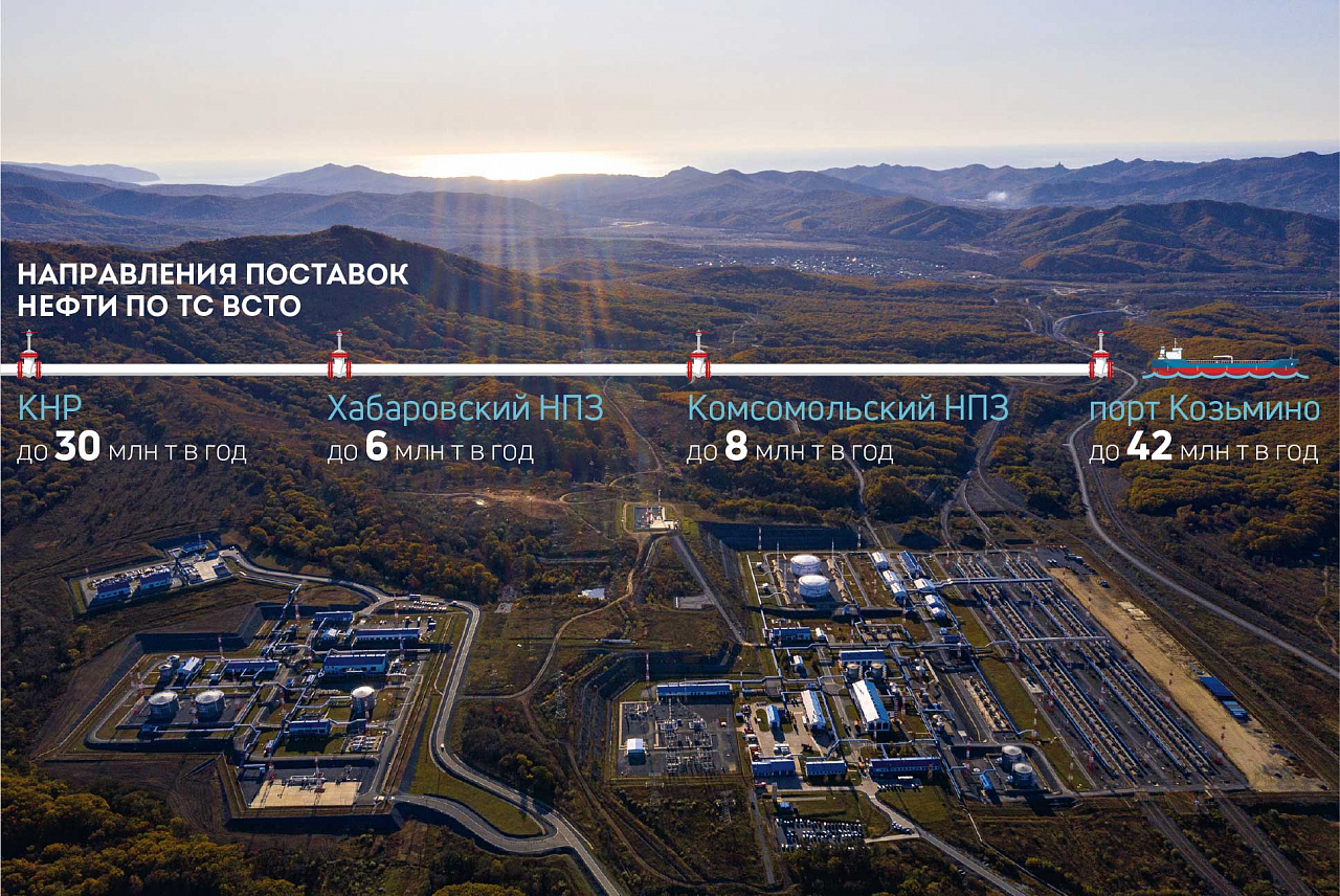 Объем принимаемой нефти в трубопроводную систему ВСТО распределяется между нефтью Западной и Восточной Сибири в зависимости от уровня добычи в Восточной Сибири. В настоящее время система магистральных нефтепроводов обеспечивает поставку по нефтепроводной системе ВСТО в Китайскую Народную Республику, на Комсомольский и Хабаровский НПЗ и в порт Козьмино для последующего экспорта.