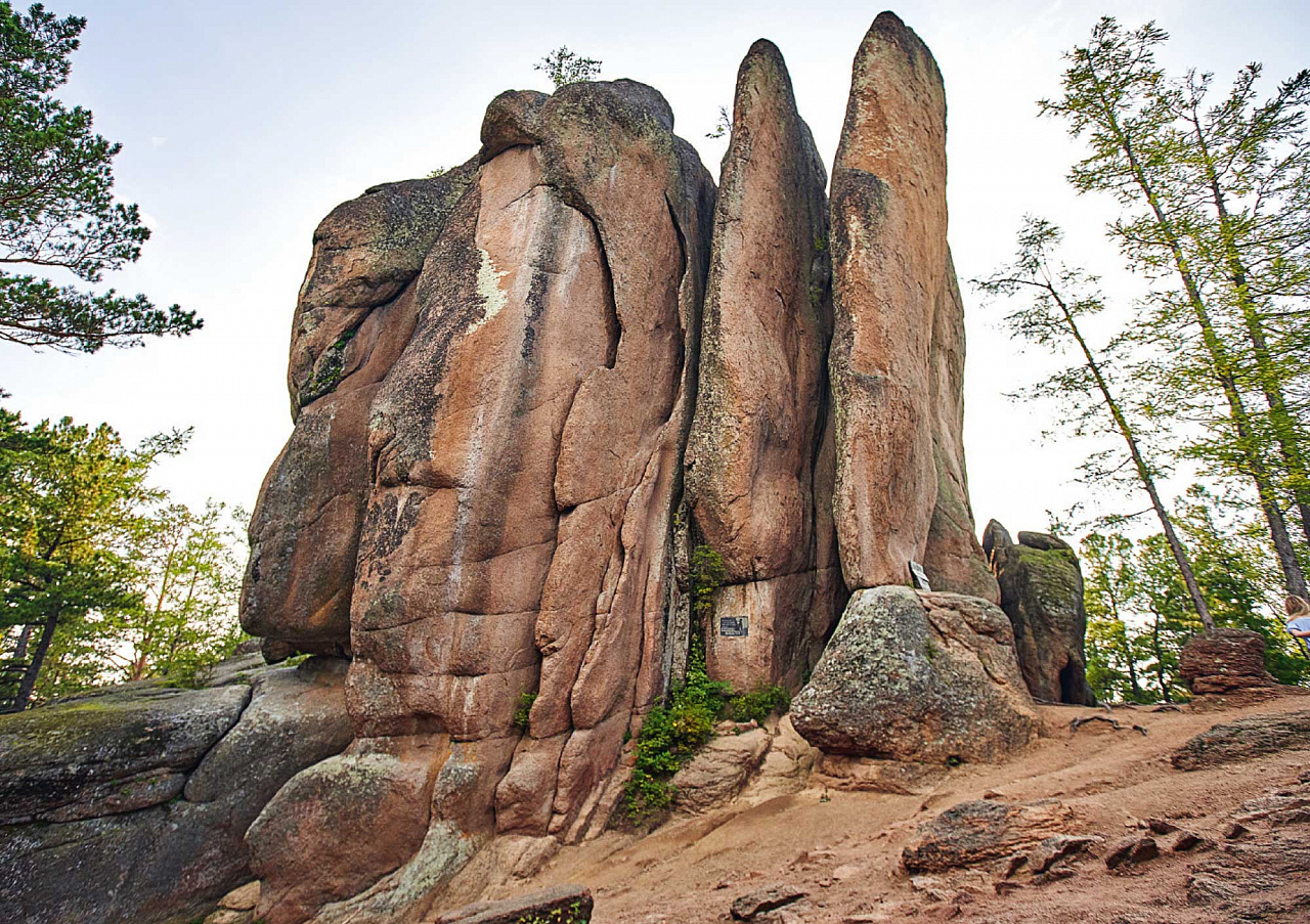Красноярские столбы — это древние сиенитовые скалы, возраст которых насчитывает от 450 до 600 млн лет. Столбы — потому что они узкие и высокие, а еще поражают разнообразием форм, благодаря которым почти каждая из сотни скал имеет свое имя, например, Бабка и Внучка, Волчий лоб, Снегирь, Китайская стенка, Чертов палец, Утиный нос и другие.