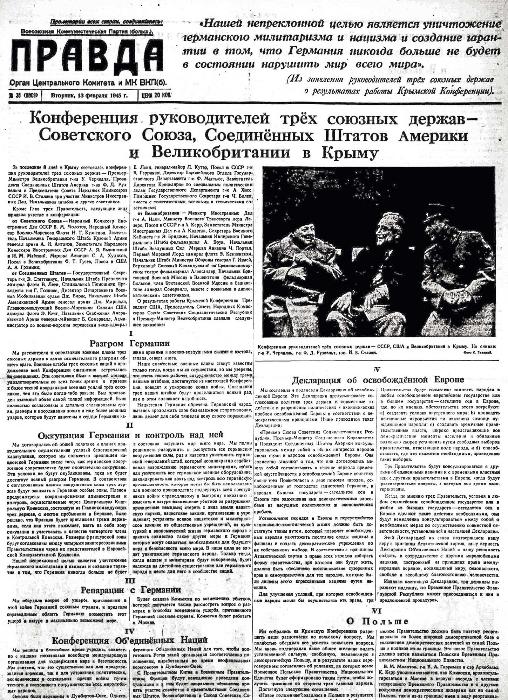 «Крымская конференция войдет в историю освободительной войны против немецко-фашистских захватчиков, как историческая демонстрация тесного боевого сотрудничества великих демократических держав в период, когда война вступила в свою конечную фазу».
