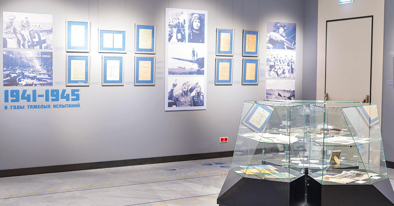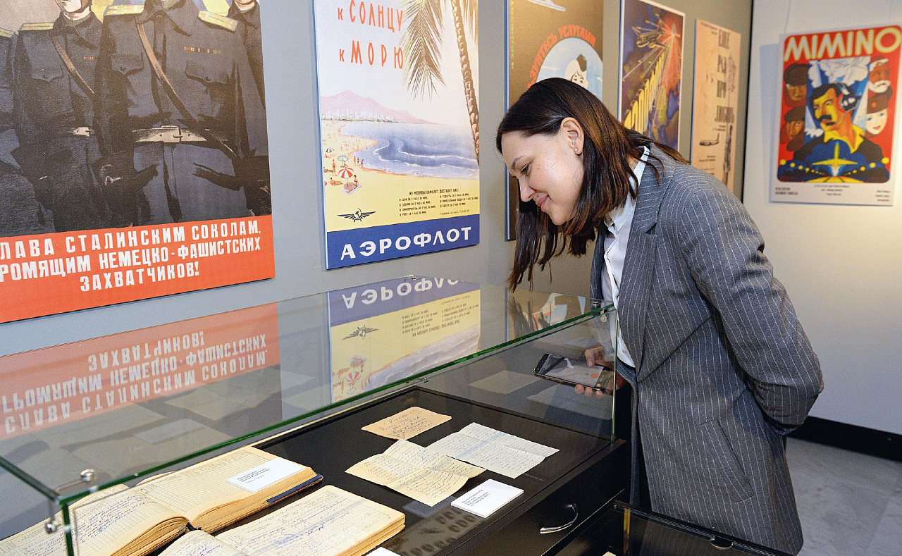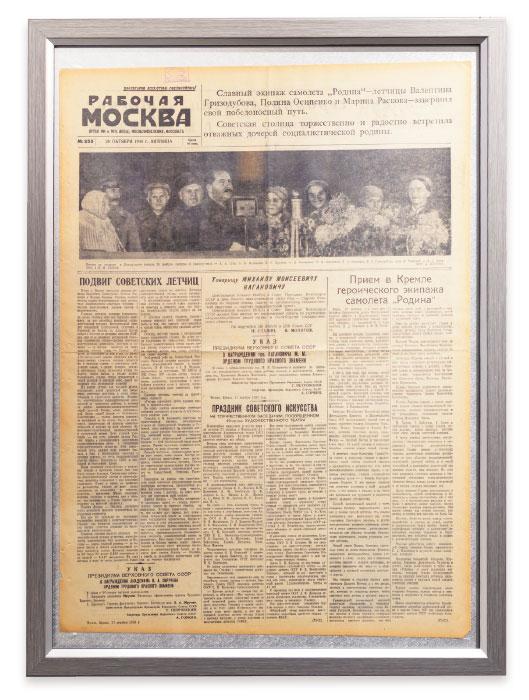 Среди экспонатов есть и пожелтевшая страница газеты «Рабочая Москва» от 28 октября 1938 года. Первая полоса посвящена подвигу летчиц Валентины Гризодубовой, Полины Осипенко, Марины Расковой, совершивших беспосадочный перелет Москва — Дальний Восток. Экипаж поставил мировой рекорд среди женщин по дальности полета — 6450 км.