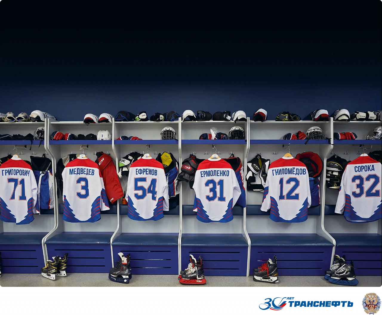 По закону жанра действие начинается... в раздевалке. Энергичная музыка, дружеские шутки, внушительные хоккейные баулы. Деловой костюм сменяется спортивной экипировкой. Массивные «панцири» для защиты груди и спины, чашки-протекторы для плеч, сверху яркие хоккейные свитера. За кулисами встречи, уже на коньках, хоккеисты «Транснефти» растут на глазах — во всех смыслах.