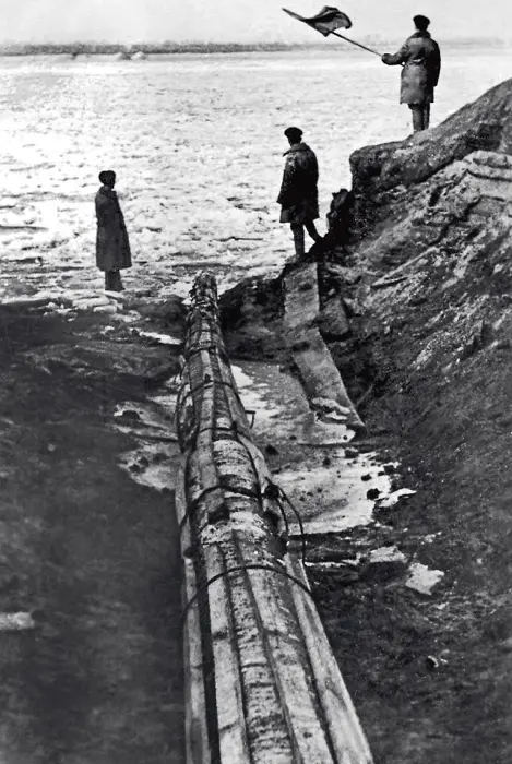 В начале 1942 года, когда пролив замерз, строители разложили по намеченному маршруту плети уже сваренных труб — 16 фрагментов, которые соединяли и устанавливали подо льдом. Потом конструкцию на стальных тросах опускали на дно, укладывая в подготовленное ложе.