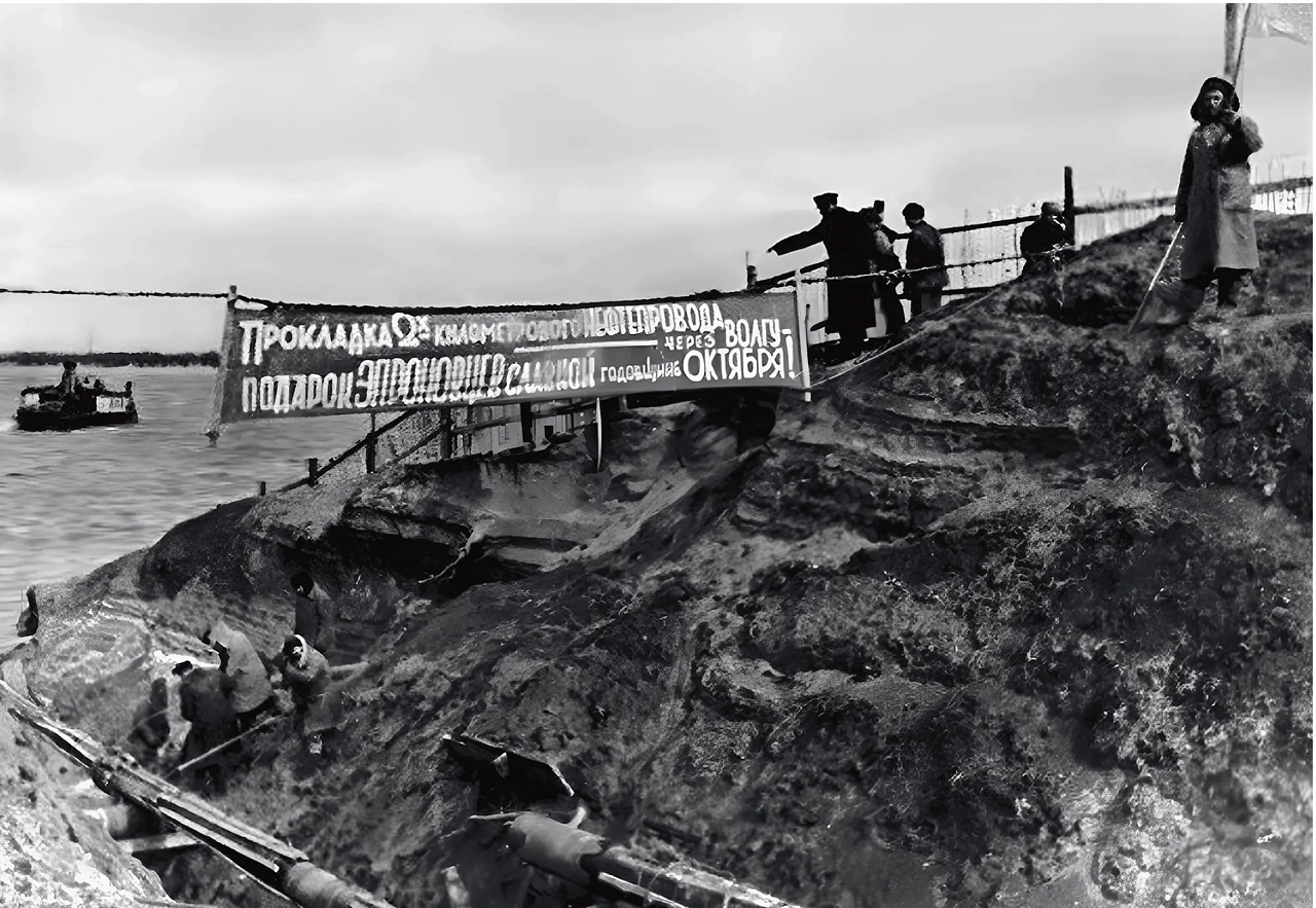 Осенью 1942 года, в разгар Сталинградской битвы, бойцы, инженеры и строители проложили сварной трубопровод по дну Волги из Владимирской Пристани на другой берег. Ни широкое русло, ни бурное течение, ни бомбежки не остановили строителей. Новый трубопровод значительно облегчил снабжение армий, которые смыкали кольцо вокруг немецких дивизий. А после победы в Сталинграде, в краю, который война выжгла дотла, за 8 месяцев строителям удалось смонтировать и ввести в действие керосинопровод Астрахань — Урбах — Саратов с восемью перекачивающими станциями, по проекту инженера Ивана Москалькова — одного из крупнейших специалистов по проектированию магистральных трубопроводов. Саратов в то время стал важным центром переработки и распределения нефти.Для строительства критически не хватало металла. Пришлось демонтировать одну из ниток старого нефтепровода Баку — Батуми. Драгоценные трубы пошли на новую магистраль. 7 ноября 1943 года по трассе диаметром 250 мм и протяженностью 655 км первую нефть доставили в Астрахань, а оттуда на фронт, в район новых наступательных операций. Без этой топливной поддержки не могло бы состояться освобождение Донбасса, Украины и Белоруссии — сражения за них окончательно сломили мощь вермахта.