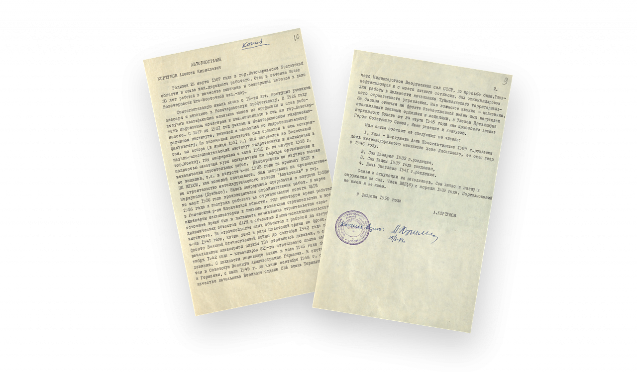 Алексей Кортунов родился в рабочей семье, в Новочеркасске, в старинном городе в области Войска Донского. Отец работал на железной дороге, и сын еще подростком был помощником машиниста. Но выбрал другую судьбу: окончил местный инженерно-мелиоративный институт, поступил в аспирантуру Всесоюзного НИИ гидротехники и мелиорации. Но защитить диссертацию не успел. Его направили на великие стройки пятилетки: возводить завод «Азовсталь» в Мариуполе (там он строил доменную печь), строить военные аэродромы…