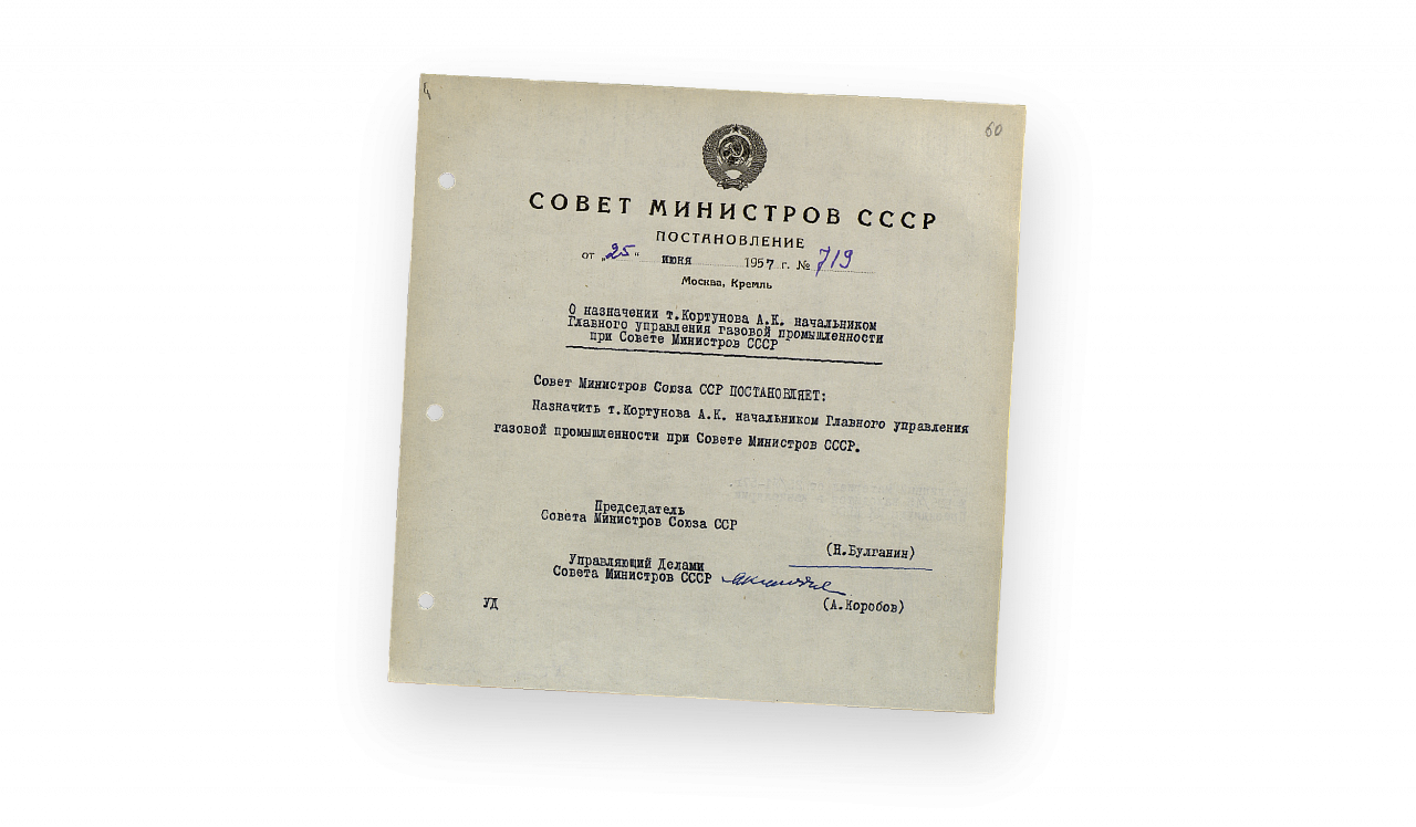 Семь лет он был министром газовой промышленности. В сентябре 1972 года в правительстве Косыгина создали мощное Министерство строительства предприятий нефтяной и газовой промышленности — Миннефтегазстрой СССР. Задачи перед новым ведомством стояли колоссальные — между прочим на основе предложений Кортунова. Надо сказать, что и Председатель Совета министров Алексей Косыгин, и Генеральный секретарь ЦК КПСС Леонид Брежнев рассматривали кандидатуры на эту должность придирчиво, понимая важность строительства топливных магистралей, станций, дорог, аэродромов, обустройства месторождений и возведение жилых кварталов для работников отрасли. Никаких щадящих сроков. А климат — такой, где можно только выживать, а не жить. Словом, лучшей кандидатуры, чем Кортунов, чтобы возглавить «всемогущую» монополию, и представить нельзя.