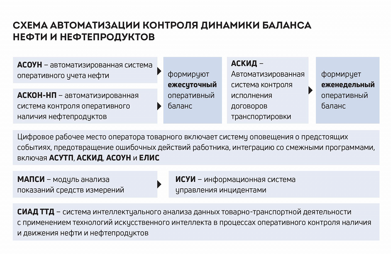 По итогам работы товарно-транспортного блока компании за 2024 год видна положительная тенденция в части ежесуточного и среднемесячного оперативного контроля за наличием нефти и нефтепродуктов. Сказалось влияние автоматизации: результаты инвентаризации стали более предсказуемы и точны. Текущая схема автоматизации по контролю за динамикой баланса включает системы оперативного учета нефти (АСОУН) и контроля оперативного наличия нефтепродуктов (АСКОН-НП), в которых ведется формирование и анализ показателей ежесуточного оперативного баланса. Далее еженедельно с использованием автоматизированной системы контроля исполнения договоров транспортировки нефти (АСКИД) проводится контроль нарастающих значений баланса путем проведения оперативной инвентаризации. Такой подход обеспечивает прозрачность, предсказуемость и последовательность сбора информации, данные в эксплуатационных системах сохраняются непрерывно и в нужном объеме.